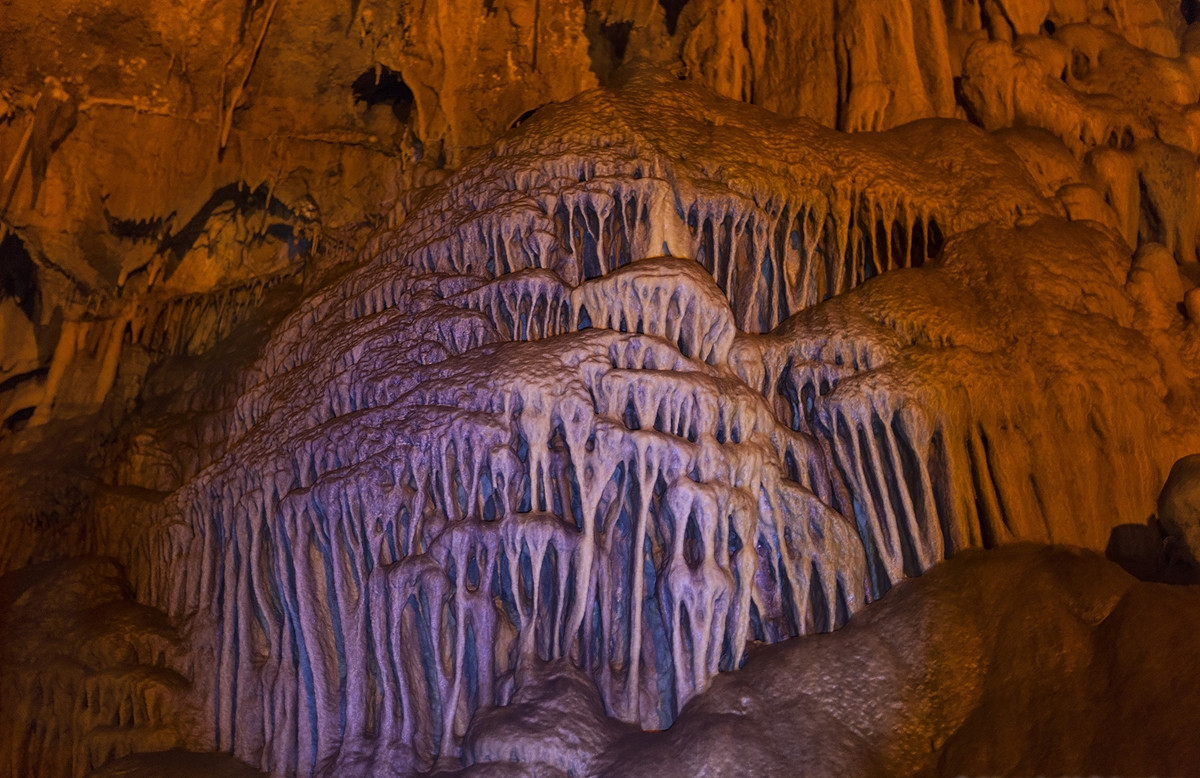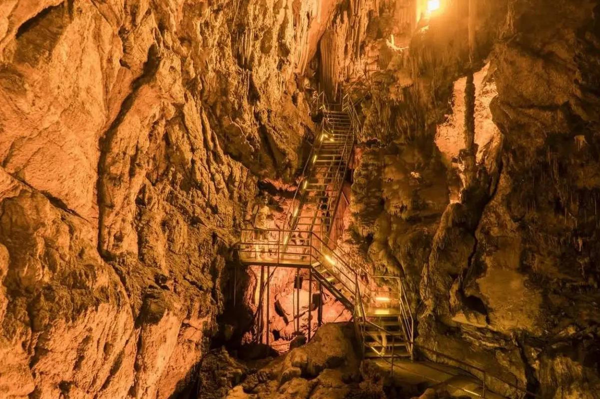 Пещера довольно большая. Направо — короткий туннель, налево — длинная подземная тропа длиной 360 метров с лестницами и поворотами. С потолка свисают подсвеченные сталактиты — «медузы», «черепа», «башни» и прочие сюжеты, которые можно интерпретировать бесконечно: как будто природа решила, что хватит делать просто камни, и ушла в артхаус. А в самом конце вас ждет озерцо с выросшими прямо из воды сталагмитами — финальная сцена с налетом мрачного волшебства.