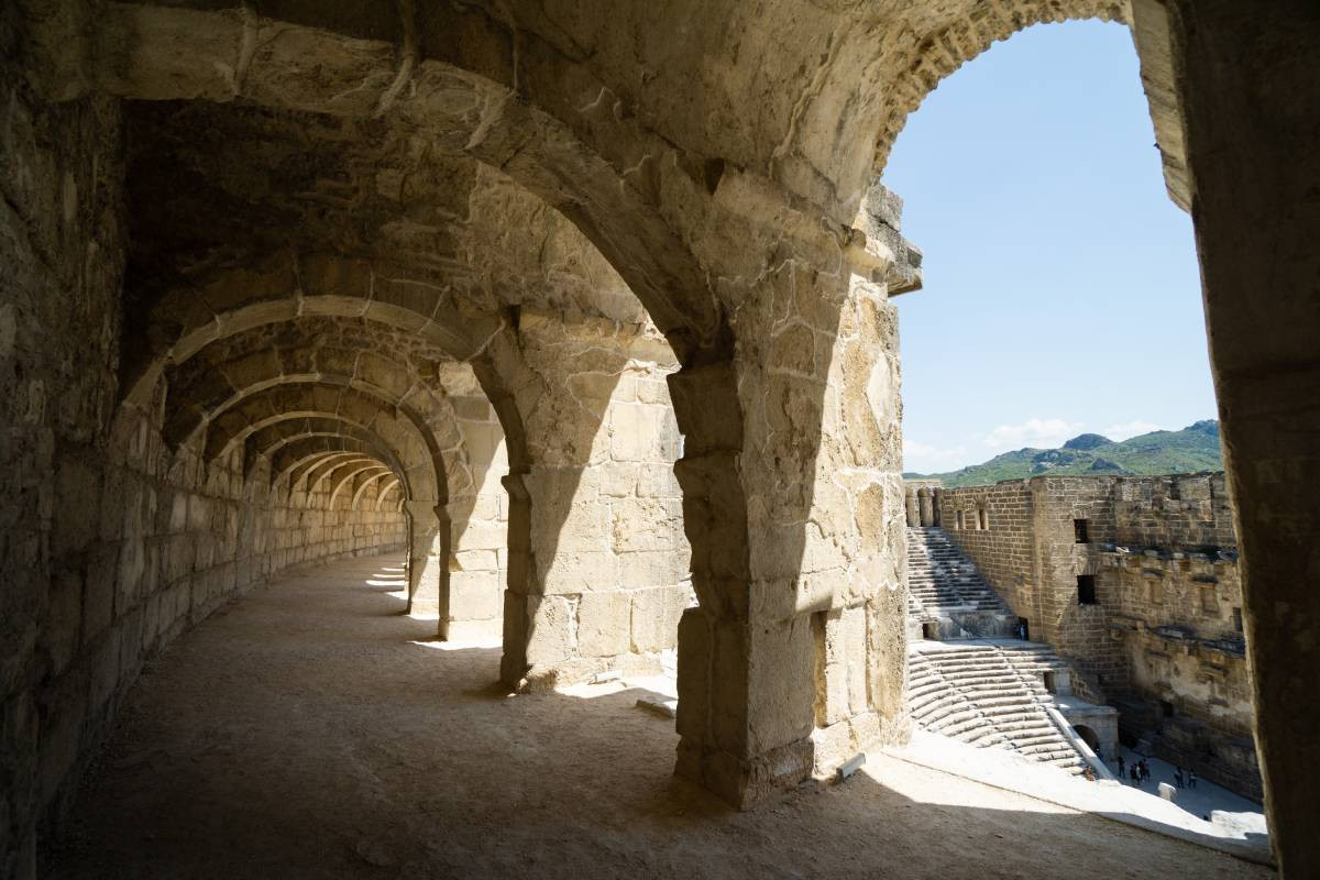 Построили эту махину во времена императора Марка Аврелия. Зрительный зал вмещал около 7,5 тыс. человек, а если учитывать все лестницы, то и до 8,5 тыс. набегало. И нет, это не арена для гладиаторских боев, как пишут в некоторых путеводителях, — в Аспендосе дрались разве что за лучшие места на трагедии или ораторские выступления.