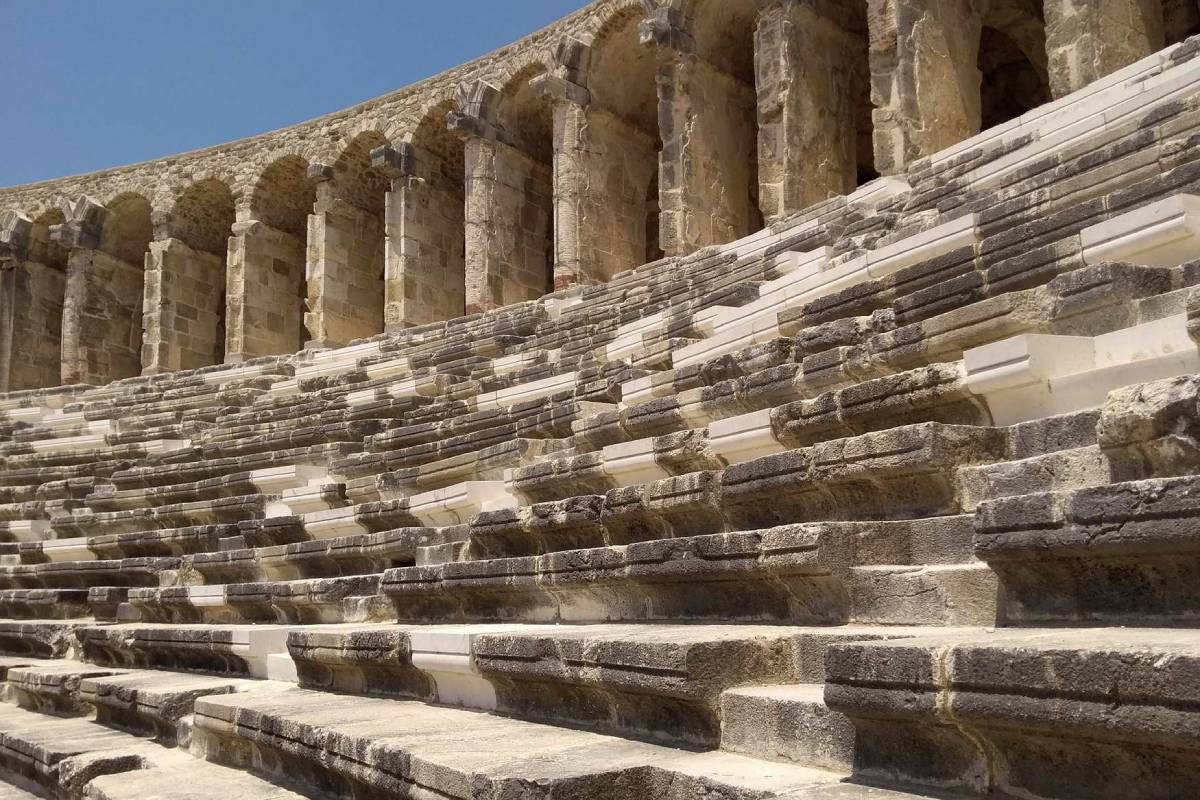 Если античные руины у вас ассоциируются только с обломками колонн, съездите в Аспендос. Здешний римский театр II века сохранился почти в первозданном виде. Сцена, арки, трибуны — все на месте. Даже акустика: можно встать на середину оркестровой площадки, негромко сказать что-то, и это услышат на самом верхнем ряду. Проверено туристами, которые сначала не верят, а потом начинают бормотать что-то в центре полукруга — просто чтобы удостовериться.
