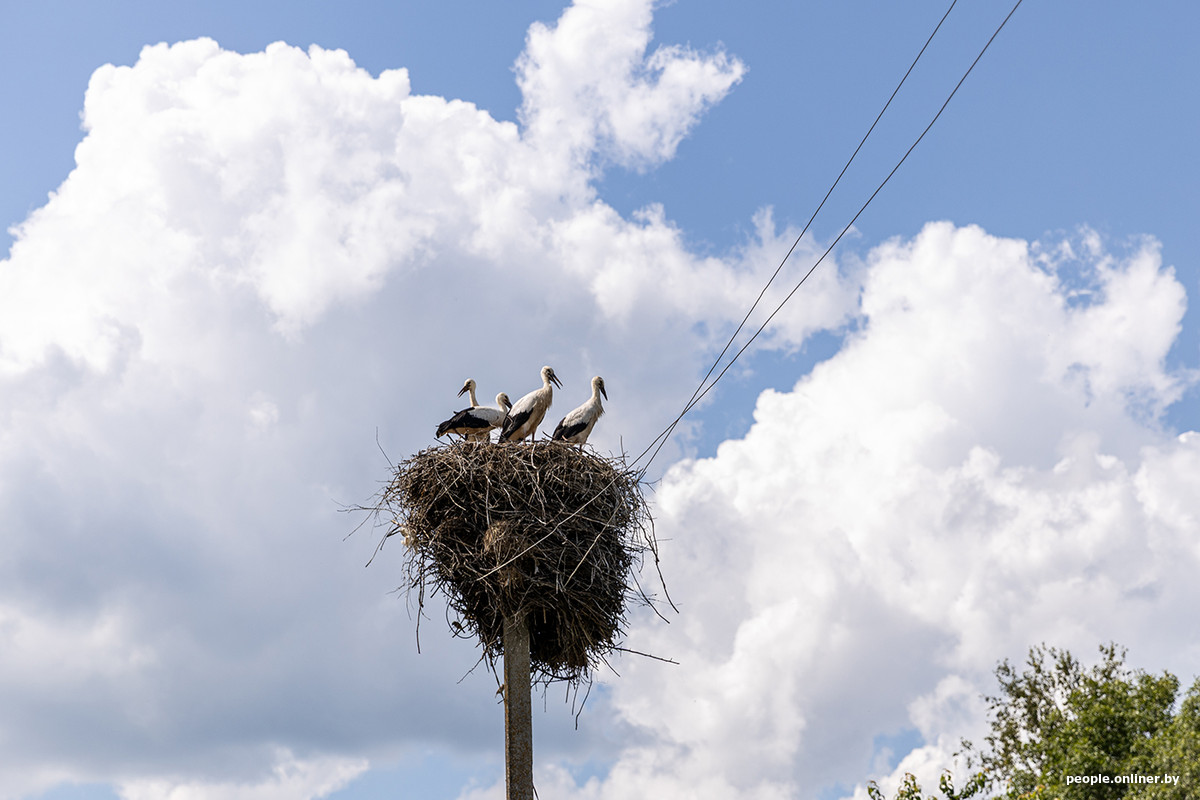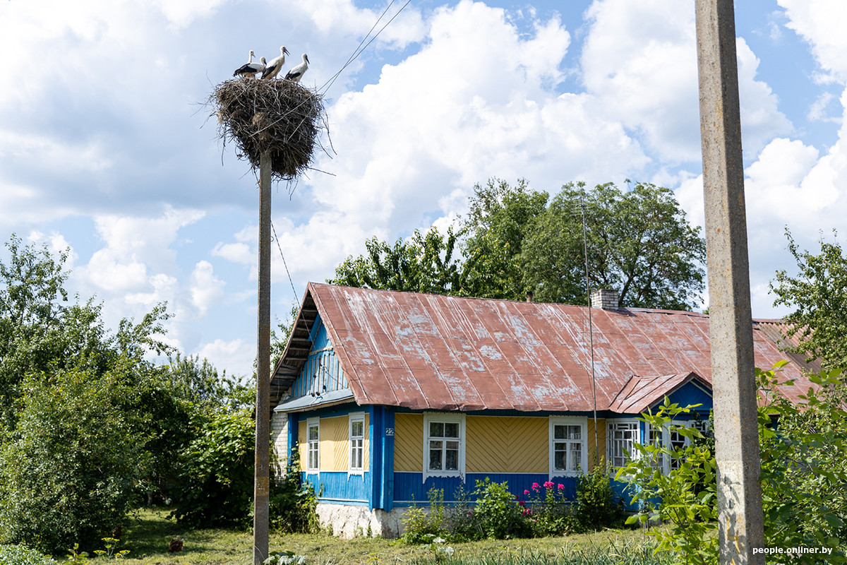 Местность здесь холмистая — в какой-то момент кажется, будто попадаешь в «белорусскую Скандинавию». По обочинам щиплют траву козы, на столбах гнезда аистов — а это верный знак того, что люди рядом. Деревни застроены неплотно, дома находятся на приличном расстоянии друг от друга.
