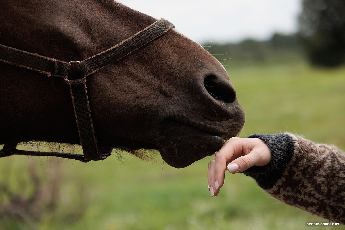 Это лошадка Фрида, знакомьтесь. Начинаем наш деревенский фотосет с нее. Папа Алеси шутит, что это самое бесполезное животное из всех, что у них есть. Но на самом деле это он ее однажды и спас.