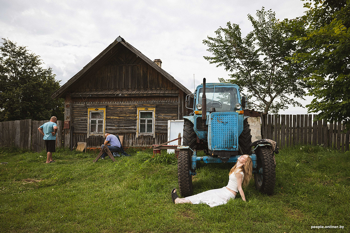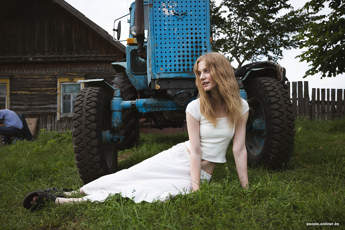 Деревенские мужики активно наблюдают за процессом: любуются. Кстати, наверняка это первая и единственная фотосессия Алеси в резиновых сланцах, а не на каблуках. И в этом что-то есть, согласитесь.