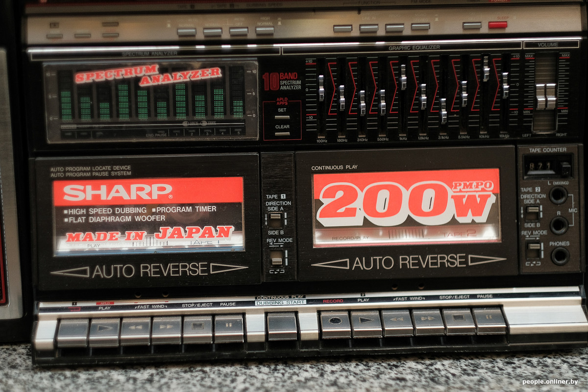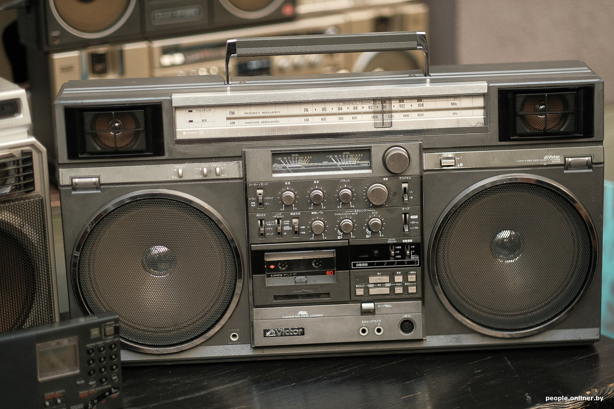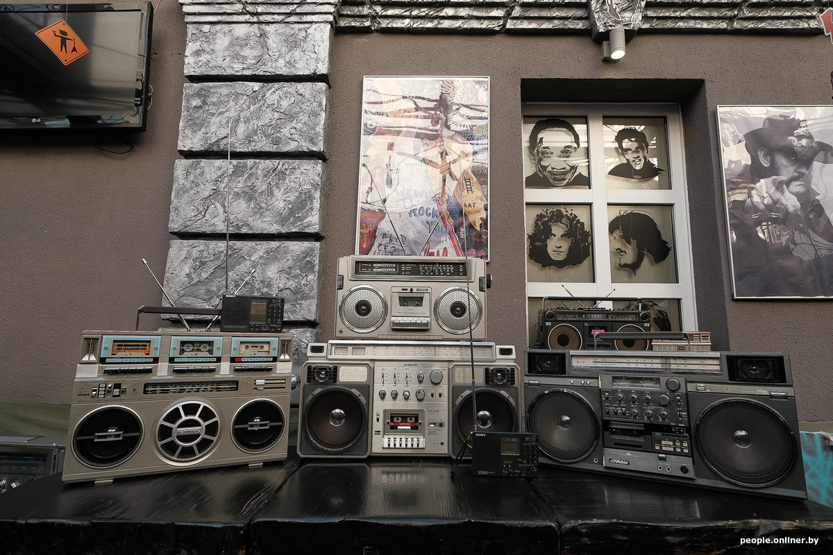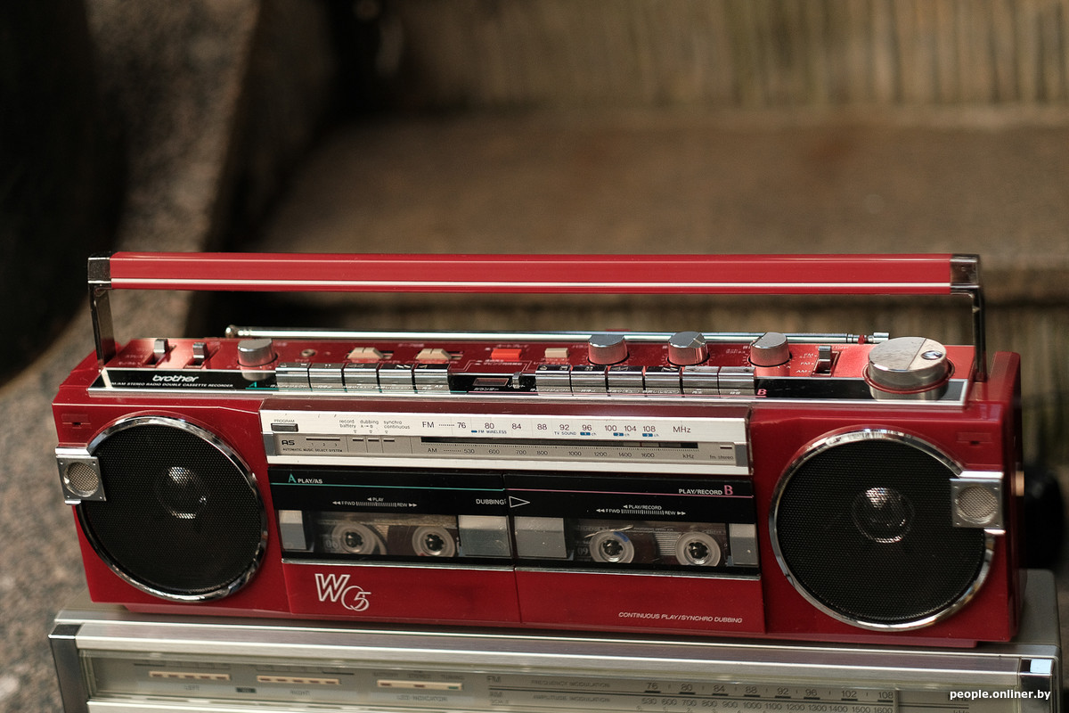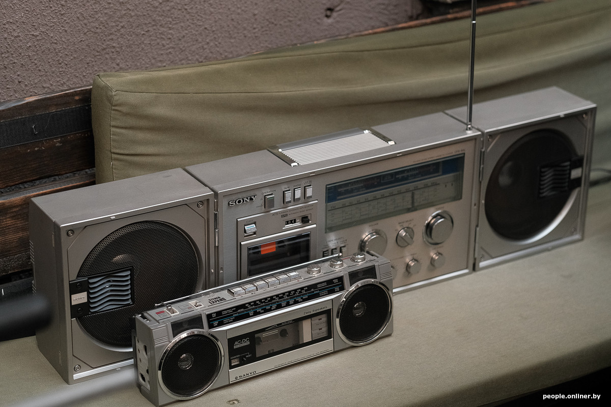 Олег ставит нам винил на восстановленных вручную Sharp VZ 2500 и VZ 3000 — музыкальные центры работают на батарейках, но на плече их особо никуда не унесешь. Тяжеловато, да и мешают датчики, которые дают добро на воспроизведение, только если агрегат стоит на ровной поверхности. Другое дело аккуратный белый «кирпичик» Sharp QT 89 — с таким в 1980-х вы были бы нарасхват на любой домашней вечеринке. А со сверкающим огоньками бумбоксом, стоящим чуть правее, — звездой всех пляжных дискотек на Минском море.