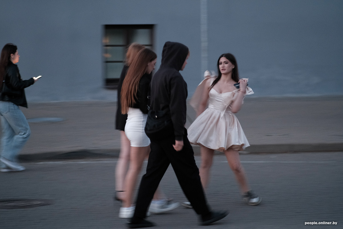 Люди вокруг нарядные и смешные. Только что перед нами прошла дама в сумасшедше красивом вечернем платье и с укладкой, на которую она явно потратила не один час, учитывая, что та все еще держится к утру. Вот только шла она змейкой, а за обеими ее щеками была шаурма, купленная в той самой богатой и загруженной по выходным фастфуд-точке Зыбицкой.