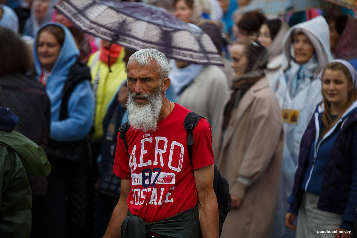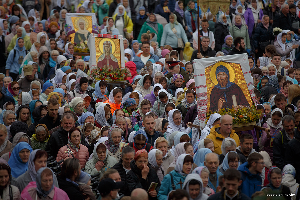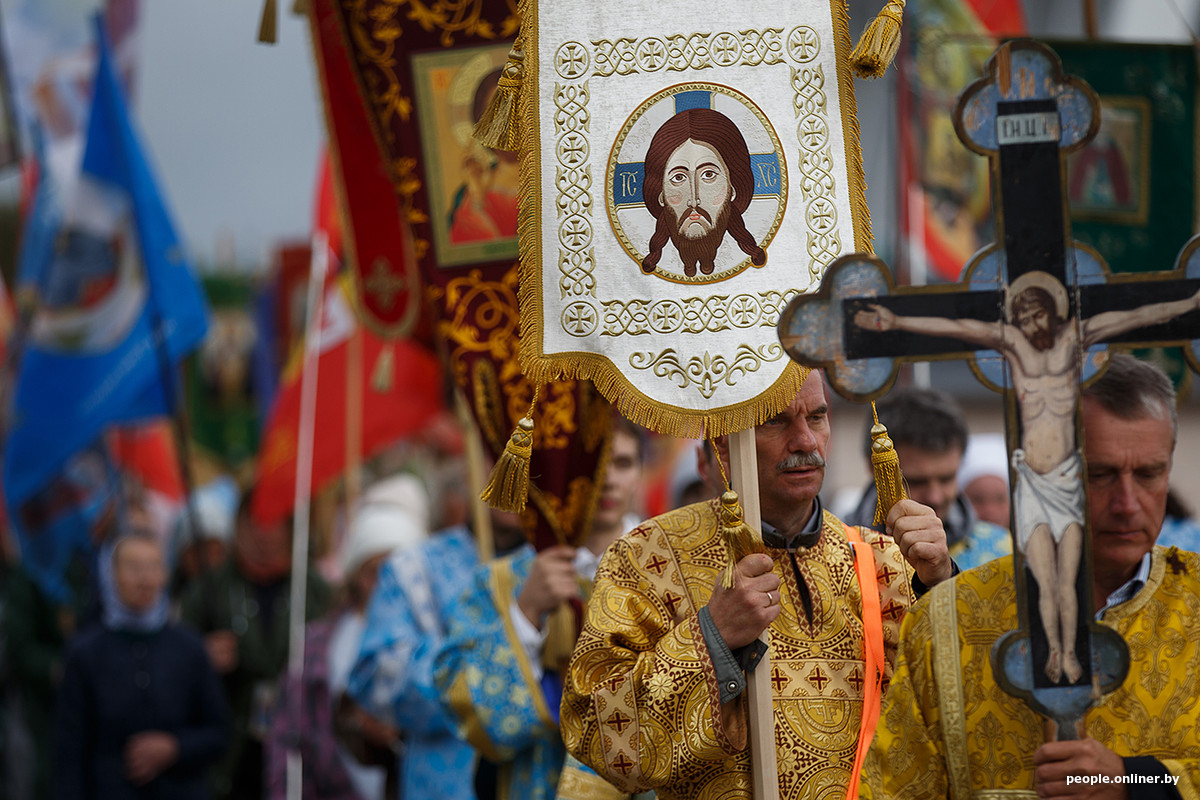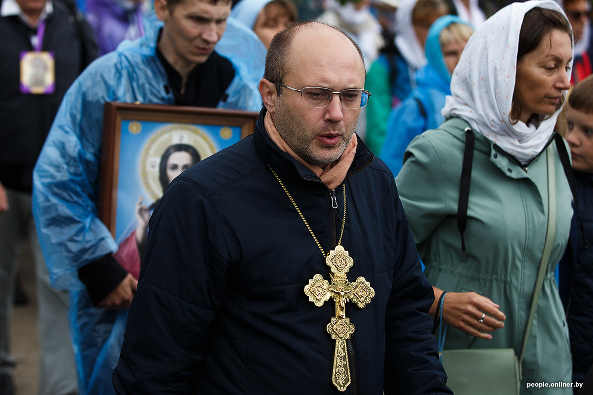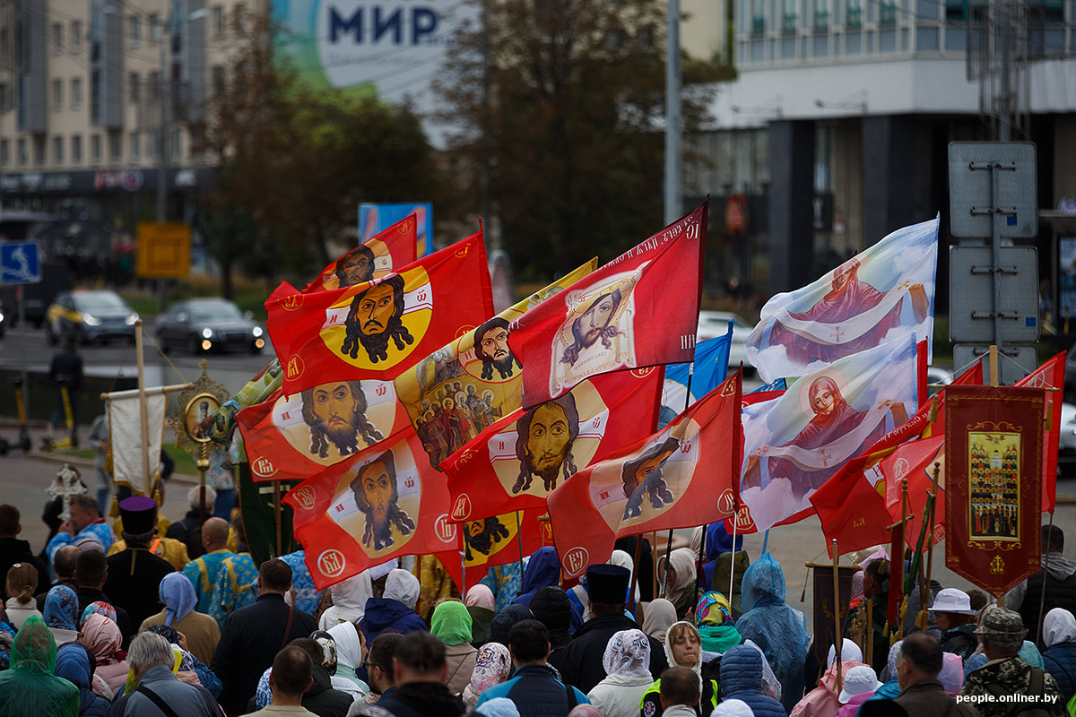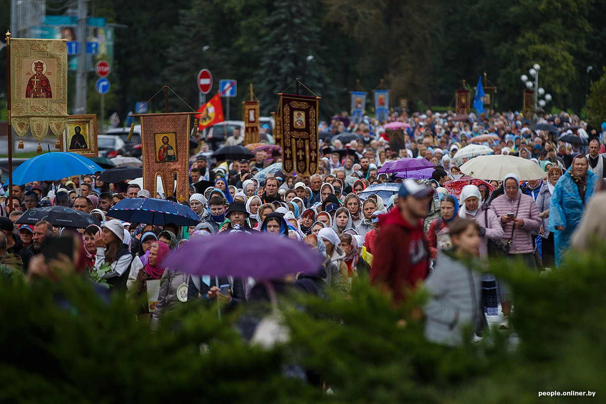Во вторник на проспекте Победителей минчане могли наблюдать необычную картину: в сторону центра двигалась процессия с иконами и хоругвями. Под дождем в плащах и с зонтами люди растянулись в колонну длиной почти в сотню метров.
