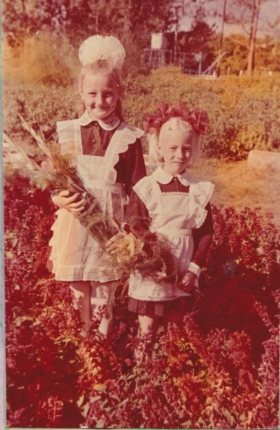 «Я училась в деревенской школе в деревне Нарочь Мядельского района. В 1990 году пошла в первый класс. Так как фотограф в деревне был нечастым гостем, мы делали памятные фотографии с родителями и друзьями. В памяти остались приготовления к 1 сентября: покупка школьного коричневого платья, черный фартук и нарядный белый бант. Где-то мама достала красные импортные туфельки (в девяностые выбор был невелик) и букет гладиолусов. Тогда он мне казался огромным! Большие красные и оранжевые цветы, зелень, елочка — такой классический букет первоклассника в те годы», — пишет Ольга.