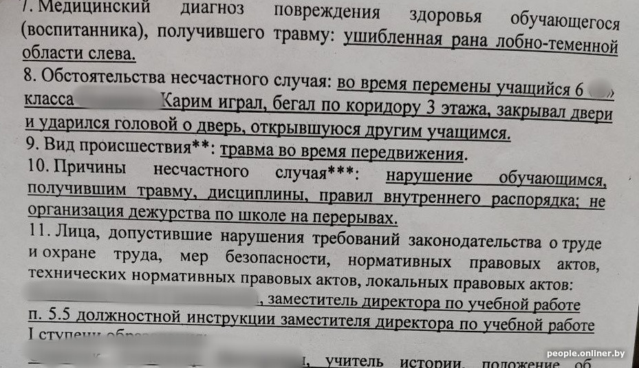 В «Акте о несчастном случае с обучающимся» (документ составляется согласно алгоритму, о котором мы расскажем чуть позже) обстоятельства описываются так: «Во время перемены учащийся 6 „Б“ класса Карим Р. играл, бегал по коридору третьего этажа, закрывал двери и ударился головой о дверь, открывшуюся другим учащимся». В причинах указано «нарушение обучающимся, получившим травму, дисциплины, правил внутреннего распорядка».