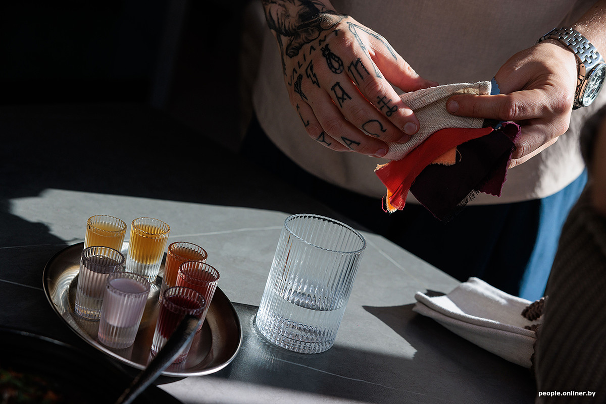 — Дело в том, что алкогольных напитков у наших предков исторически было не так много. Это крамбамбуля, квасы, пиво — и в целом все. Поэтому пришлось представить, что мой прапрапрадед придумал бы, если был бы стародавним белорусским барменом. А идея с тактильностью и тканями ее художественно усложняла. Я старался каждый шот по текстуре, вязкости и общему впечатлению приблизить к определенному материалу. Например, «Шелк» — это прозрачность, легкость, нежность. Легкий голубой оттенок ему придают васильки. Цвет из них вытянуть было очень трудно, но мы легких путей не ищем, — увлеченно рассказывает Валентин о своем детище.