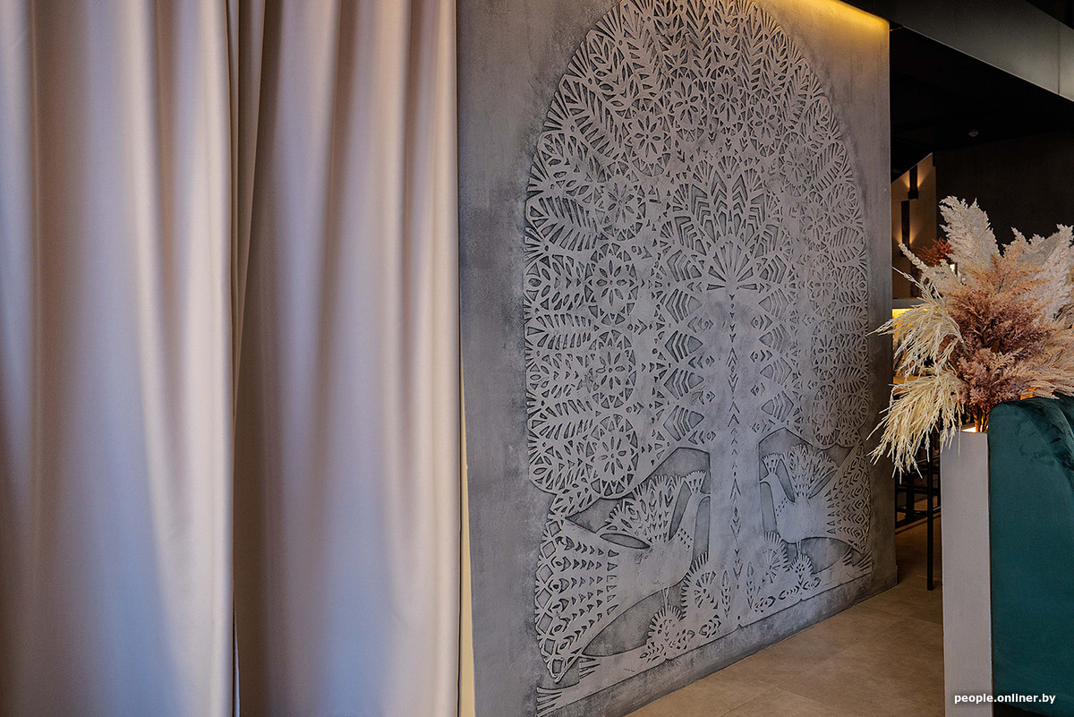 Сам проект ресторана разрабатывали долгих полтора года. Мелочей будто бы не было вовсе: несколько десятков вариантов дизайна, идеально рассчитанные расстояния между столами с индивидуальным светом над каждым из них, огромная вытинанка на стене, стоившая художнику двух недель работы. Даже посуда здесь такая, которой, по словам Влада, в Беларуси нигде не найти. Он сам неоднократно отвечал гостям: «Извините, мы можем подарить вам тарелку, но не сказать, откуда мы ее взяли».