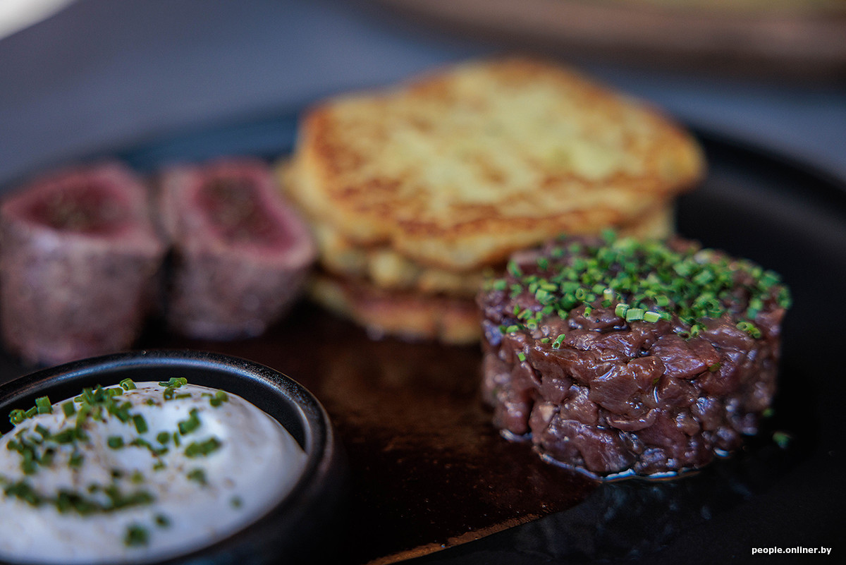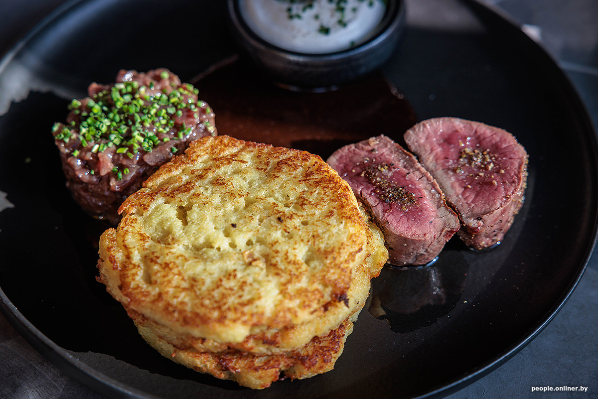 — Это драники с олениной. На тарелке тартар и стейк из оленя, а драники, в общем-то, выступают, грубо говоря, дополнением. Дичь, во-первых, достать сложно, во-вторых, готовить надо по-особенному. У нас пока есть олень и лось, наш управляющий Павел вот еще мечтает о медведе. Было бы, конечно, интересно с таким мясом поработать.