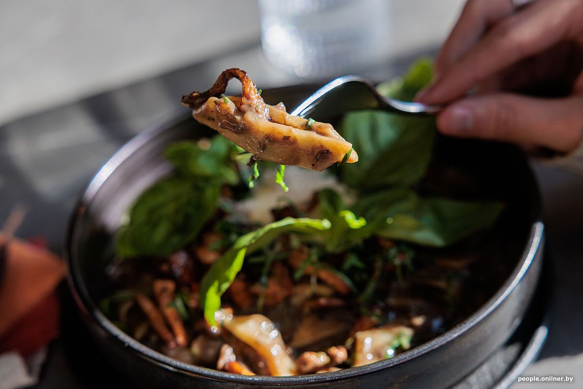 Необелорусских блюд, за которые глаз цепляется, бегая по меню, тут еще много: и борщ с брусничным вареньем, и салат с «конопляным песто» (все законно, честное слово), и шоколадный фондан из бородинского хлеба с мороженым из белых грибов. Чисто на бумаге все это выглядит как что-то, что придумали на спор. Но, попробовав блюда, осознаешь, что все эти сочетания в итоге работают, причем взаимодействуют неожиданно нежно и органично. Хоть и вкусовые сосочки на языке поначалу могут сходить с ума.
