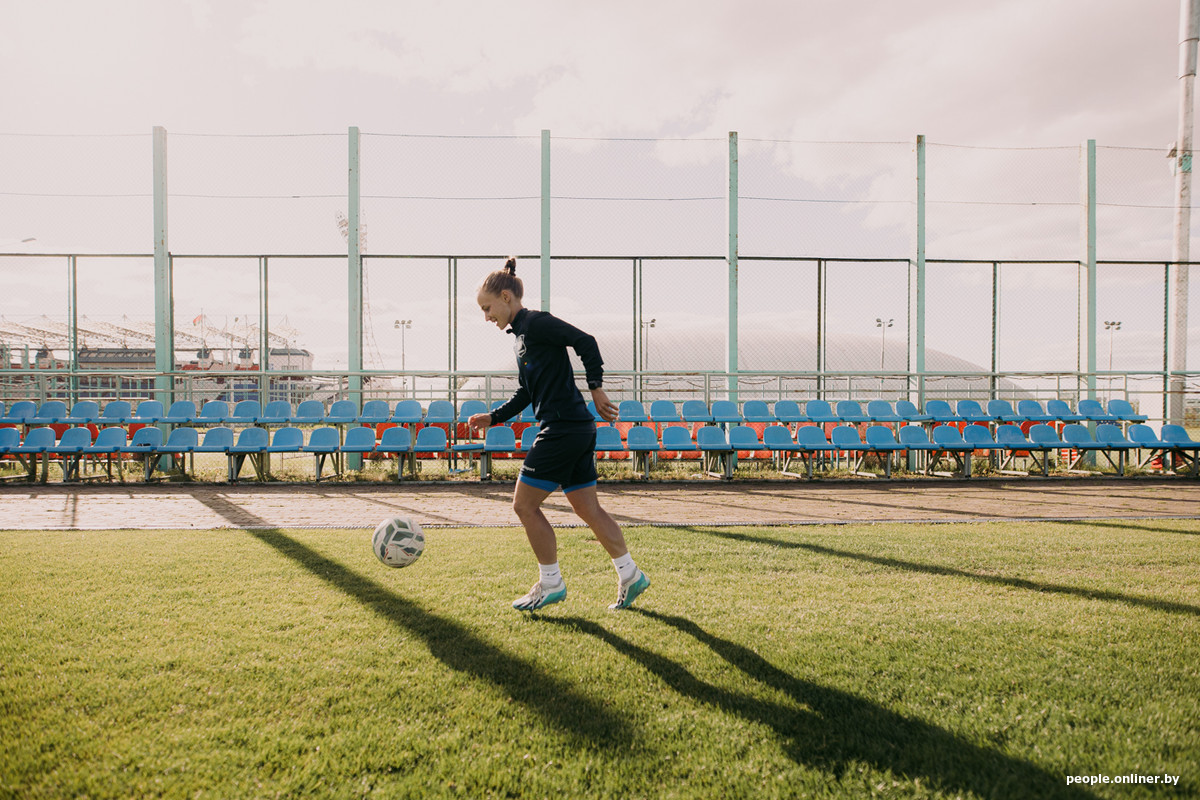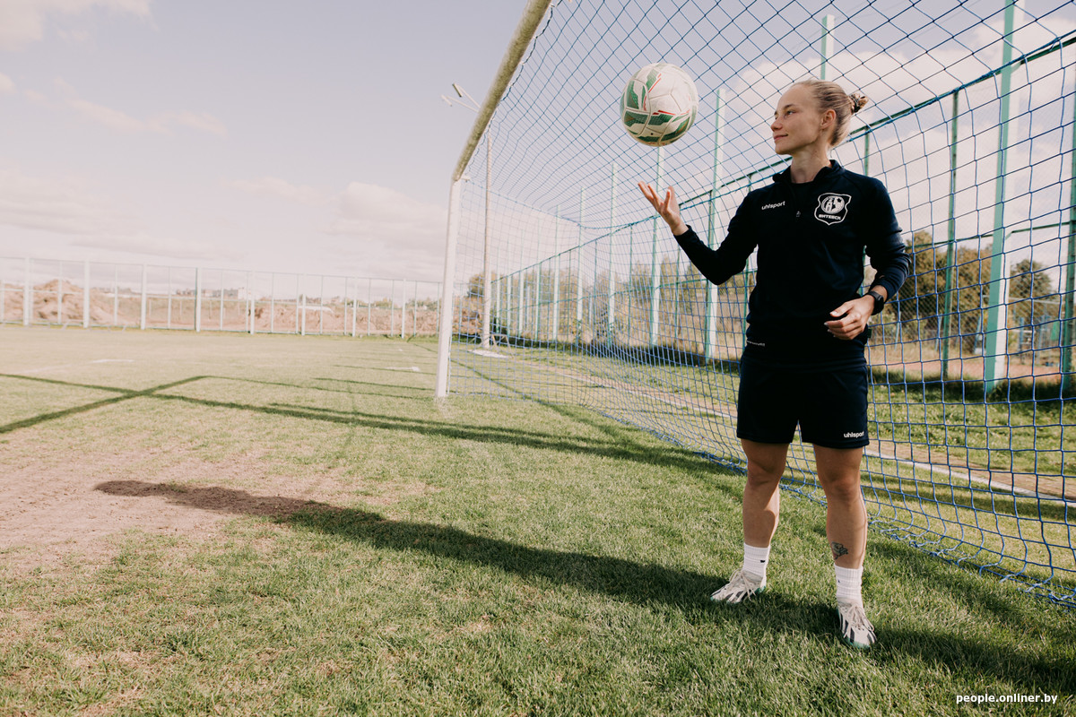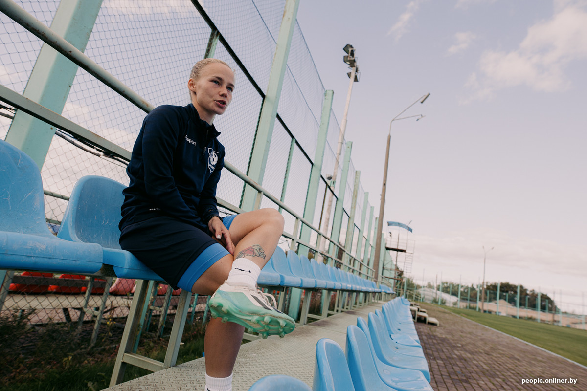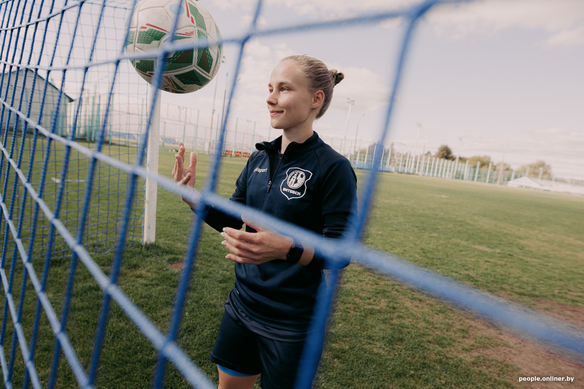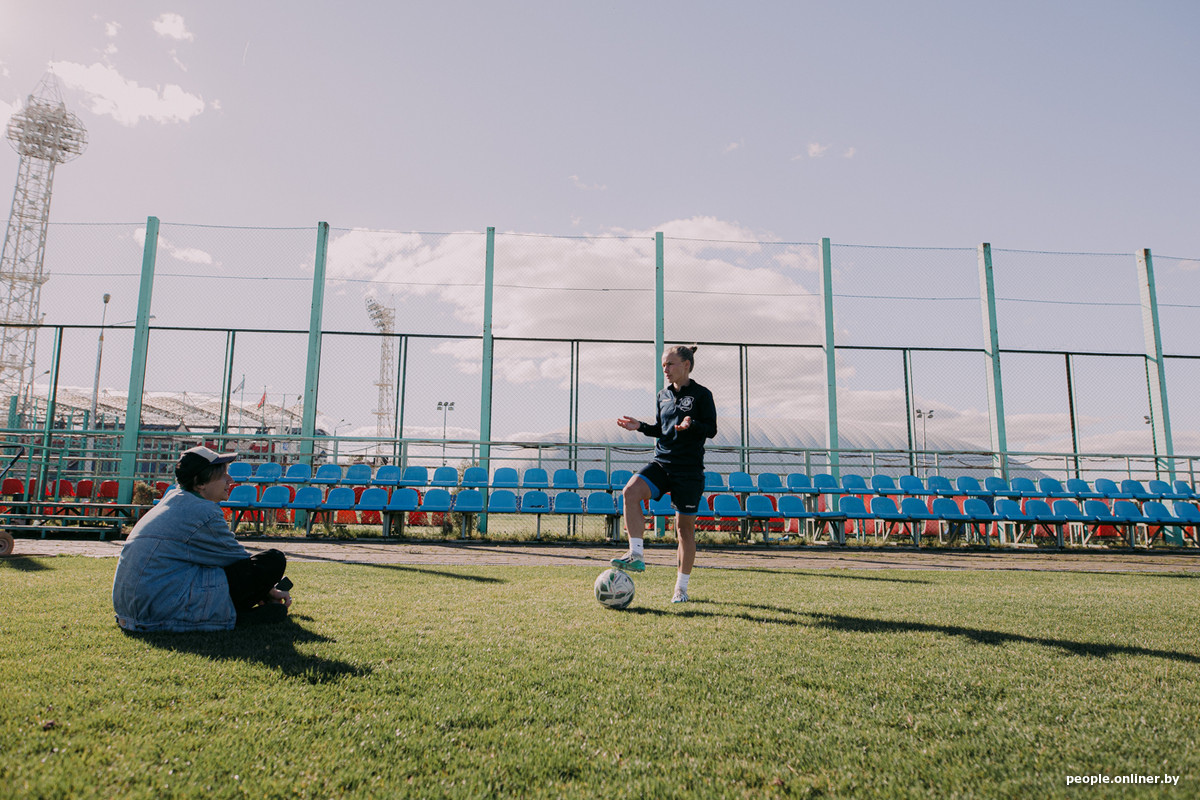 В последнее время мы зачастили в Витебск. Но что поделать, если тут так много интересного. Сегодня вот нас пустили на местный стадион, где играет и тренируется ФК «Витебск» — и женская, и мужская команды. Причем женская даже чуть поуспешнее. Наша героиня только что закончила тренировку, но осталась с девчонками из команды, чтобы еще поиграть и попозировать для нас на камеру. На улице прохладно — им бы пойти погреться, но никто не жалуется.