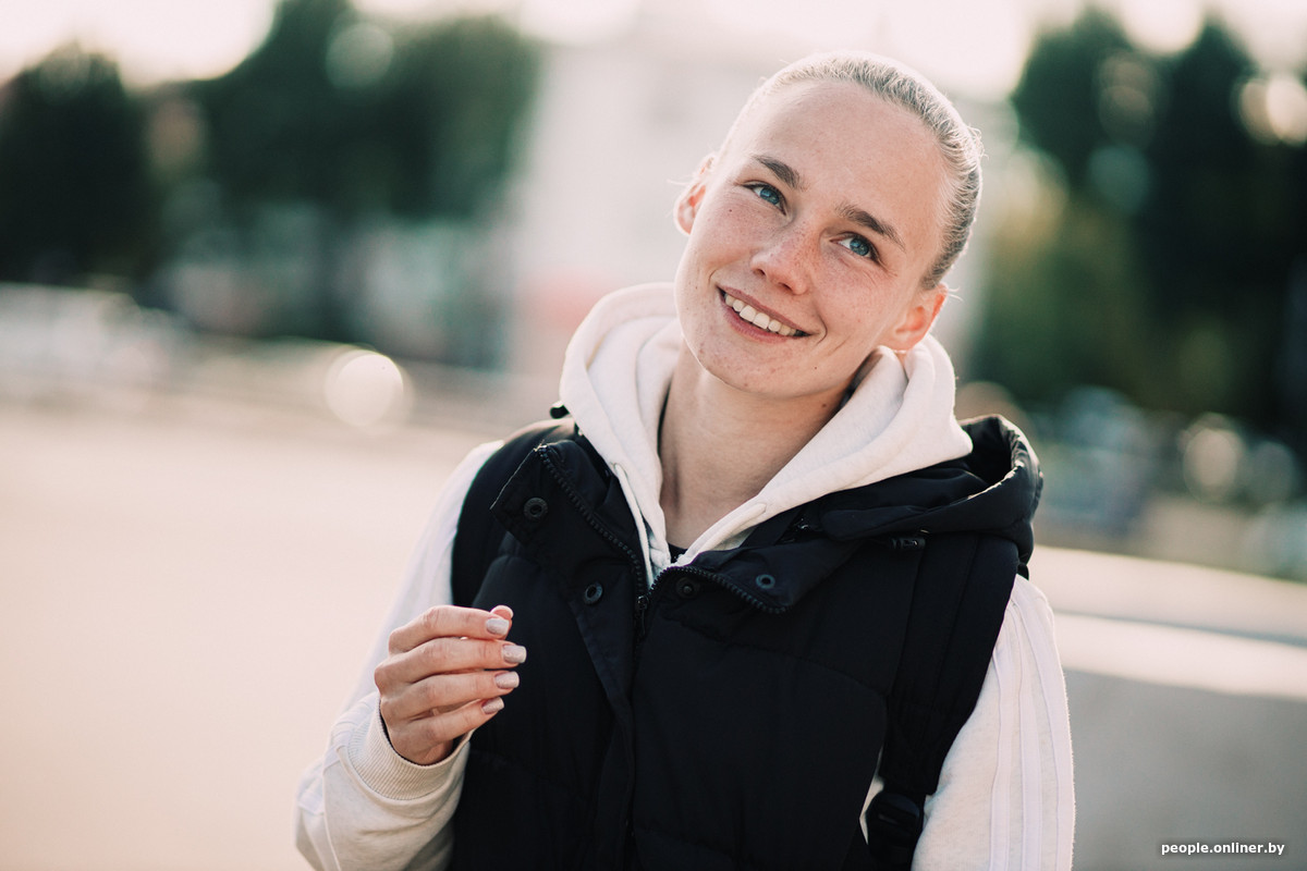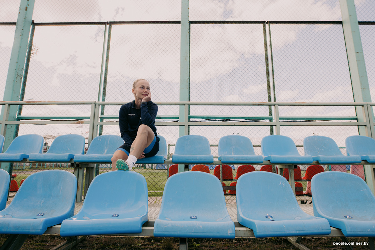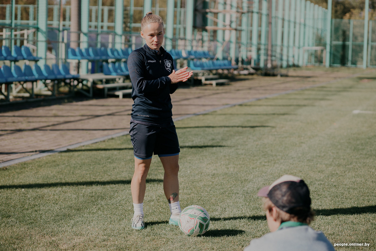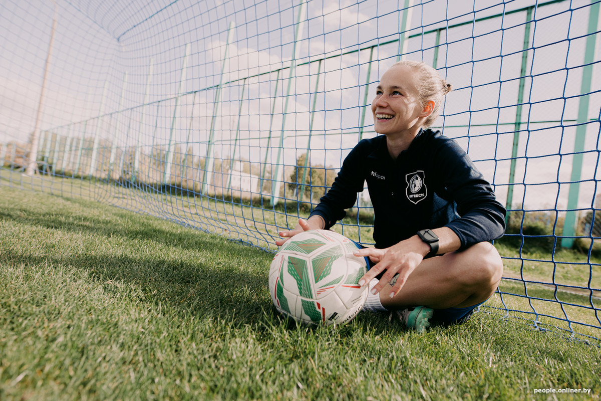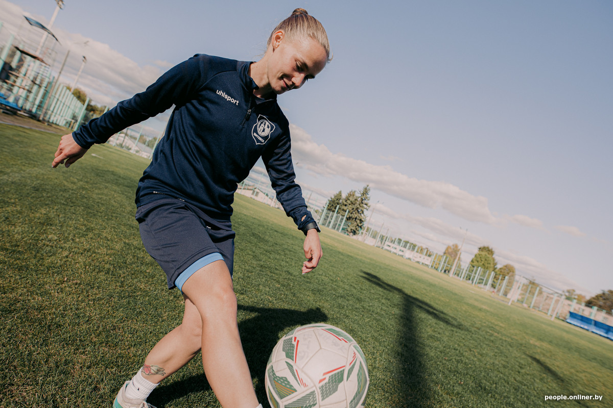 В последнее время мы зачастили в Витебск. Но что поделать, если тут так много интересного. Сегодня вот нас пустили на местный стадион, где играет и тренируется ФК «Витебск» — и женская, и мужская команды. Причем женская даже чуть поуспешнее. Наша героиня только что закончила тренировку, но осталась с девчонками из команды, чтобы еще поиграть и попозировать для нас на камеру. На улице прохладно — им бы пойти погреться, но никто не жалуется.