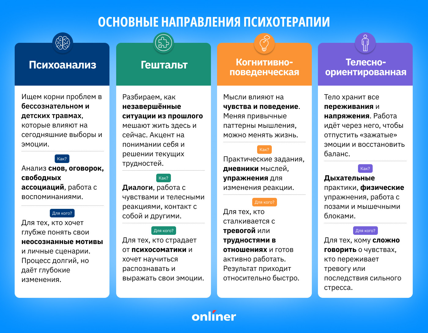 Первое, в чем можно запутаться, если вы решите постучаться в двери кабинета психолога, — это методы работы. Для удобства мы разместили самые популярные направления терапии на инфографике:
