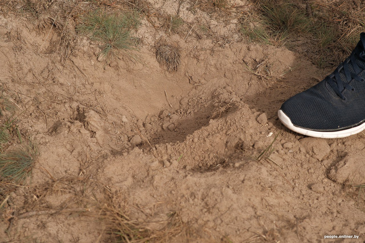 Мы выходим на холмистую полянку, и Юрий уверенно направляется к конкретной точке. Место самое обычное — таких полян в Беларуси множество, и найти кладку здесь непросто. Ничего необычного: черепахи умело маскируют свои «гнезда» под рельеф. Но наш гид сразу указывает на утрамбованную землю — сначала в одном месте, потом в другом. По его словам, именно здесь черепахи откладывают яйца. Юрий заметил, что многие самки из года в год делают это в одном и том же месте.