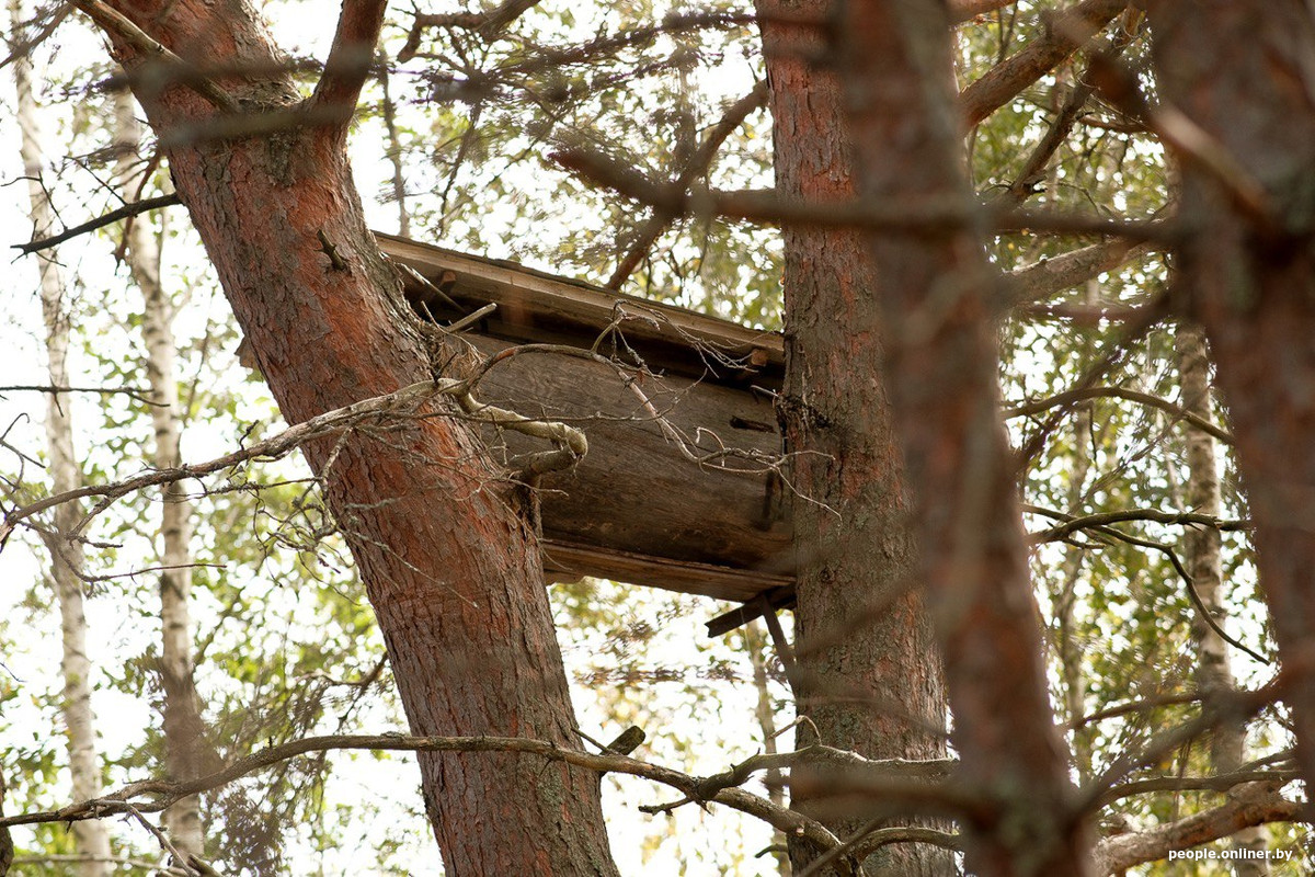 Впереди на одном из деревьев замечаем необычное сооружение — колоду. На Полесье пчелы живут не в деревянных ящиках на земле, а в домиках, установленных на деревьях, или в дуплах. Такая форма пчеловодства называется бортничеством и в 2020 году была включена в Список нематериального культурного наследия ЮНЕСКО. Делаем несколько кадров и идем дальше.