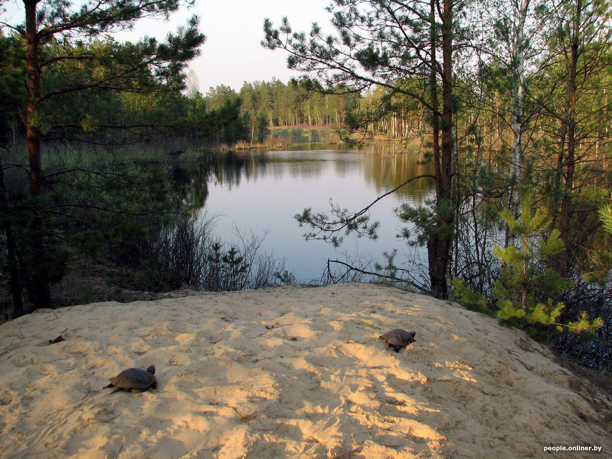 Быстро собравшись, Юрий решил показать нам место, где на протяжении долгого времени болотная черепаха откладывает яйца. Мы садимся в машину, выезжаем на старую пыльную дорогу и вскоре оказываемся у соснового леса. Подумать только: когда-то все вокруг было сплошным полесским болотом, а место, где мы оставили машину, являлось настоящим островом. Теперь же никаких следов большой воды не осталось — она где-то там, вдали, за зелеными зарослями. В глаза бросаются лишь кучи мусора, оставленные отдыхающими, охотниками да браконьерами, выискивающими в здешних чащобах диких коз и кабанов.