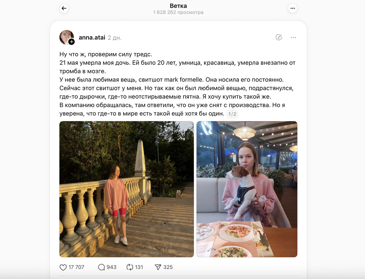 Два дня назад в Threads широко завирусился пост женщины по имени Анна, которая просила помощи в поисках розового свитшота белорусского бренда — он был любимой вещью ее дочери. Пять месяцев назад девушка скоропостижно умерла, и теперь ее мама хочет себе такой же на память. Загвоздка в том, что этот свитшот уже не продается, но Анна бросила клич с уверенностью, что где-то в мире сохранился хотя бы один экземпляр.