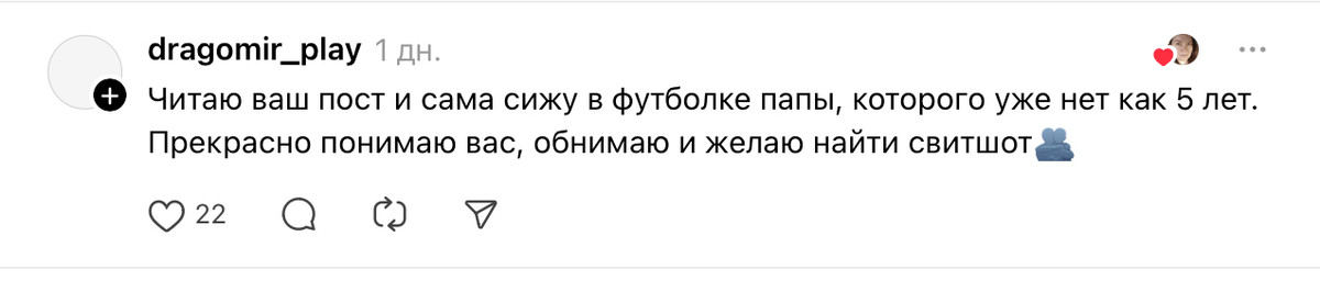 На данный момент ветка собрала больше 1,6 млн просмотров и почти тысячу комментариев. Комментаторы выражали Анне соболезнования, делились похожими историями сохранившихся вещей ушедших близких и буквально всем миром разыскивали тот самый свитшот.