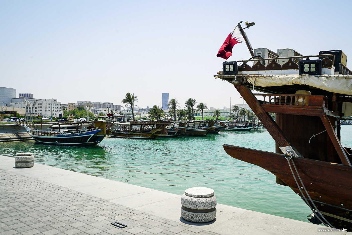 Поблизости пришвартованы десятки лодок доу — тех самых, на которых ловцы жемчуга выходили в море. Сейчас это туристический аттракцион для прогулок по заливу на закате, но раньше без них жизнь в регионе была обречена на нищету. Строили лодки, разумеется, вручную, без чертежей, используя технологии, передававшиеся из поколения в поколение. Поэтому все лодки хоть немного, но отличаются друг от друга. Считается, что для рождения хорошей лодки нужно не меньше времени, чем для рождения человека. При создании применяют прочные породы дерева, чаще всего тик, а вместо гвоздей — бамбуковые шипы.