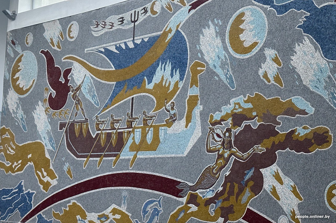 Приятный интерьер с мозаикой. Всю стену занимает масштабное панно «Отчизна» художника Александра Кищенко (кстати, его же работы украшают торцы многоэтажек в микрорайоне Восток). Выглядит монументально.