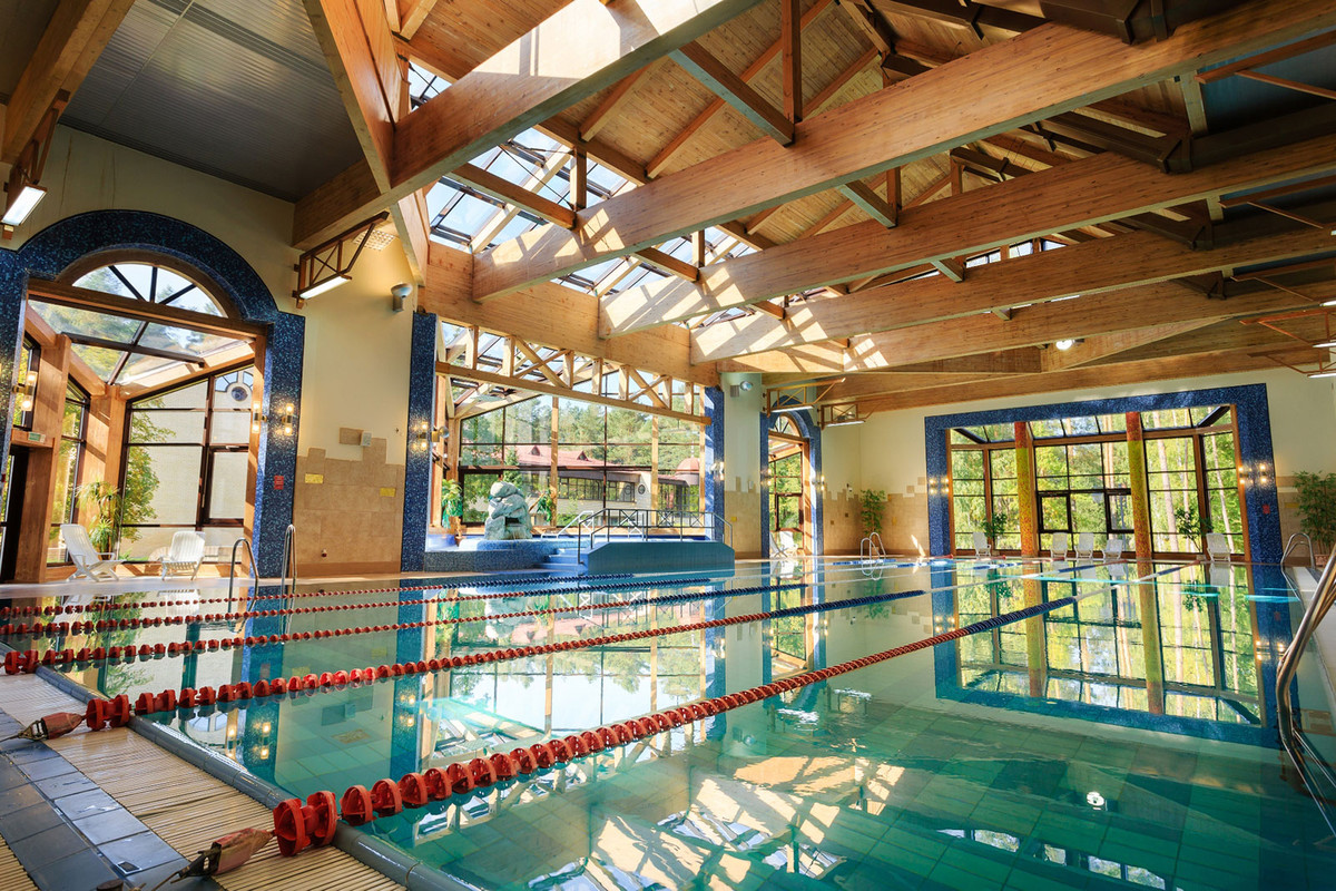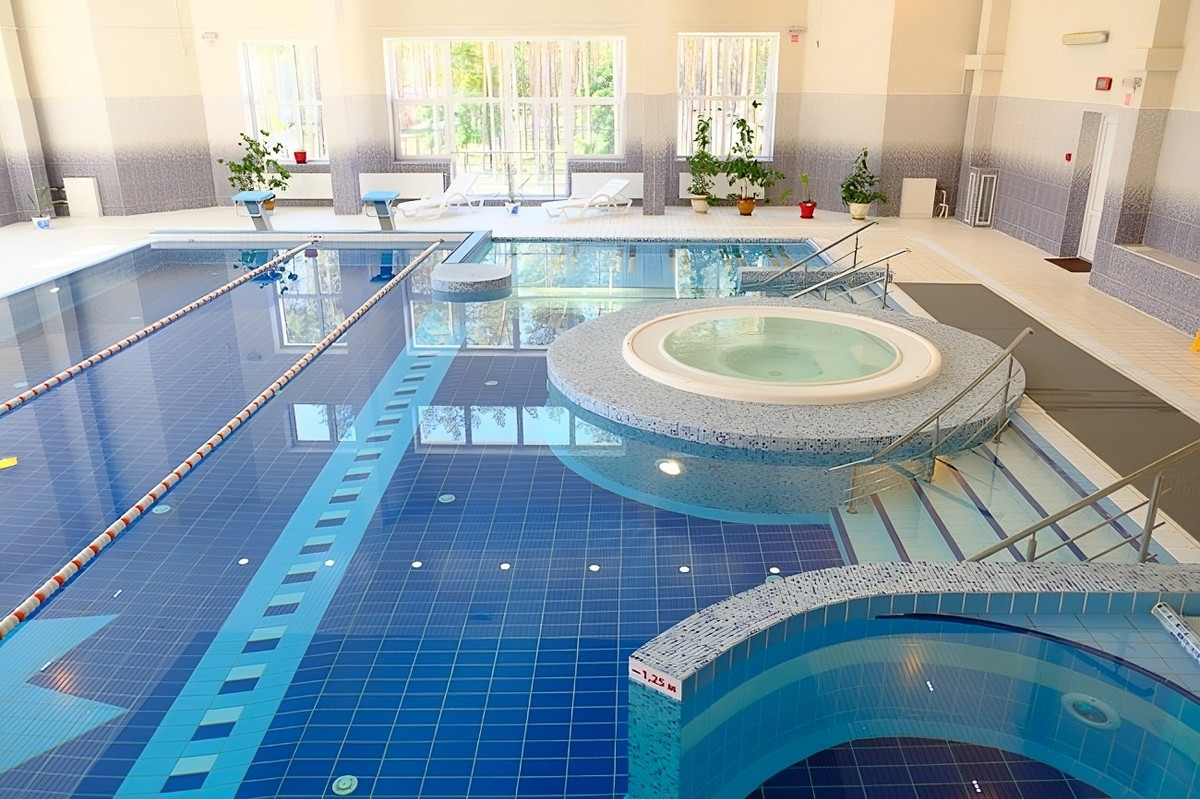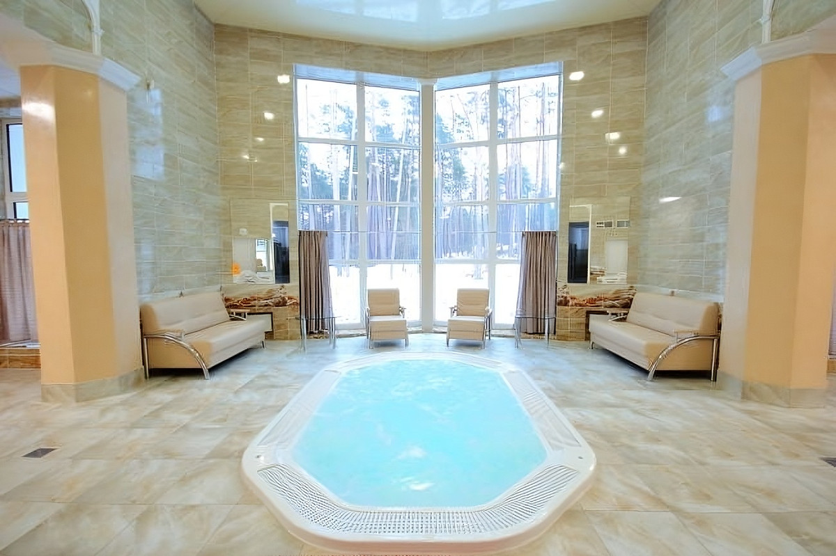 Бассейн дополнен банным комплексом. Неплохой набор услуг для компактного санатория. Джакузи, горки, финская сауна, турецкий хаммам и русская баня — все чисто, уютно и работает как надо. «Бани — отдельный кайф», «Особенно впечатлил бассейн».