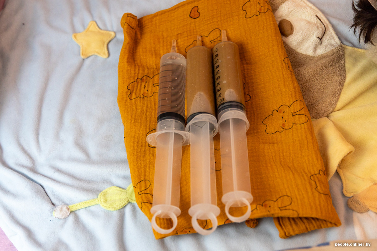 Наш приезд попал на обеденное время. Елена рассказывает, что Оля умеет есть как обычный ребенок: ложкой и через рот. Этот, казалось бы, простой навык тоже стал победой. Иногда девочка питается через гастростому, которую ей поставили еще в полтора года. Сегодня, например, в большом шприце измельченный до пюре суп — его Елена приготовила специально для дочки.