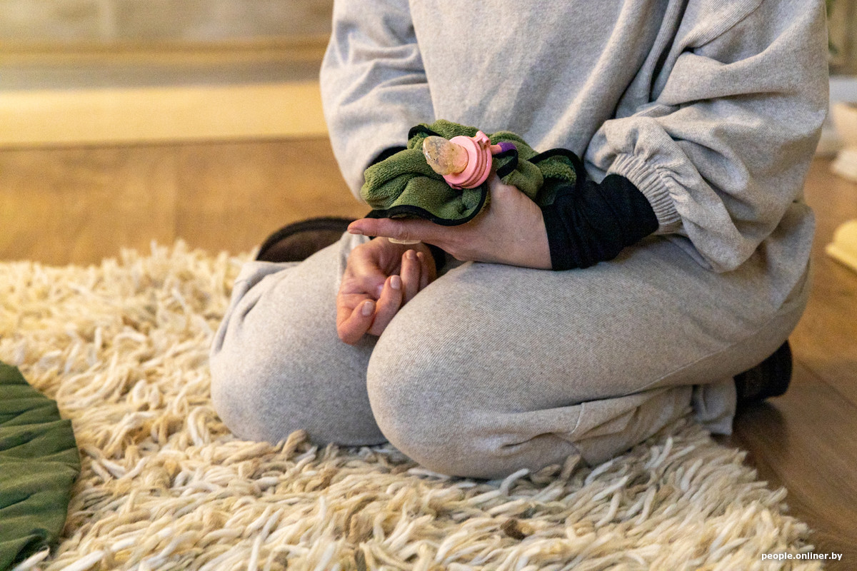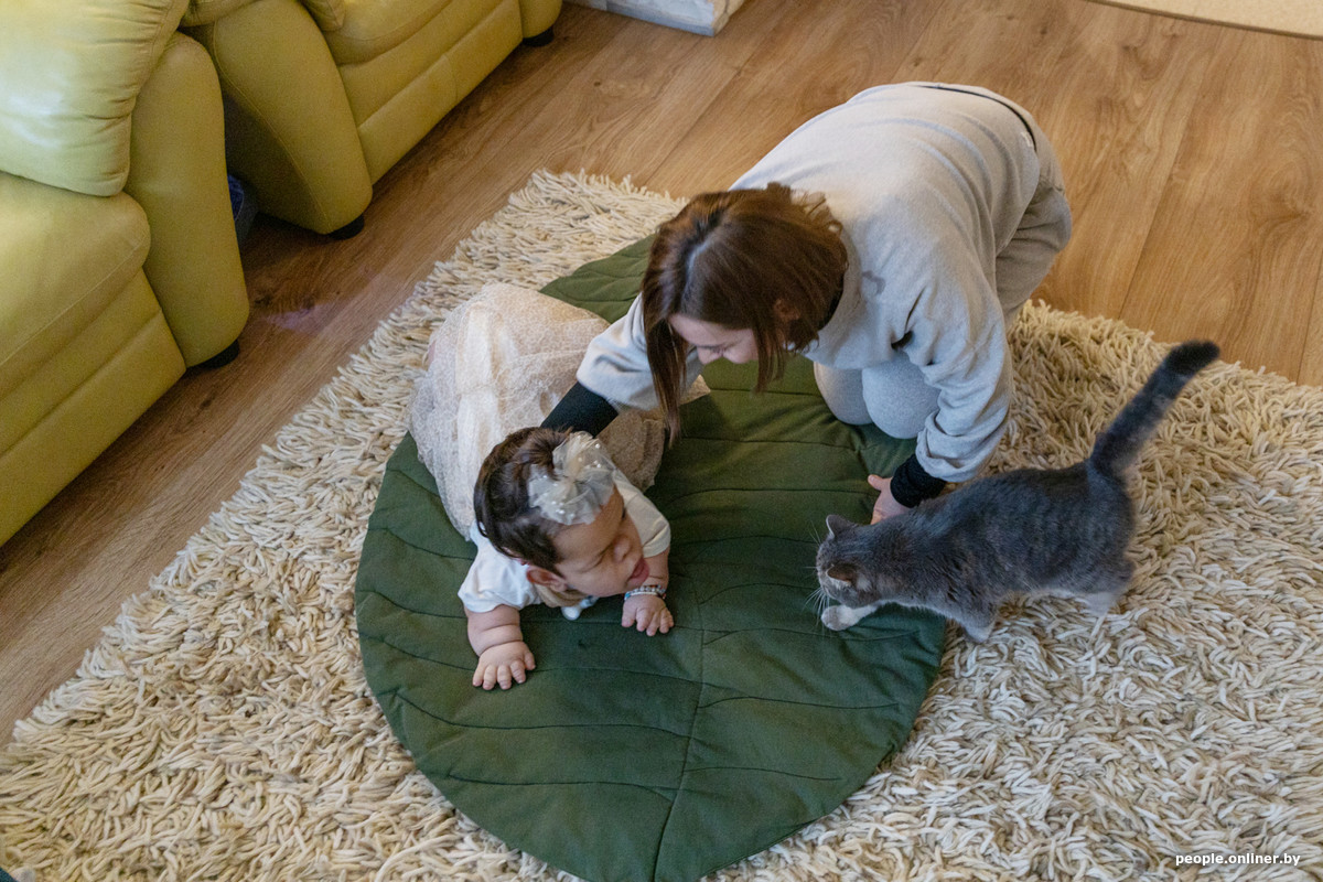 Елена расстилает небольшой мягкий коврик, а затем укладывает на него Олюшку. Девочка умеет удерживать голову и может сама перевернуться на живот. Услышав наши голоса, Оля поворачивается в попытке рассмотреть нас.