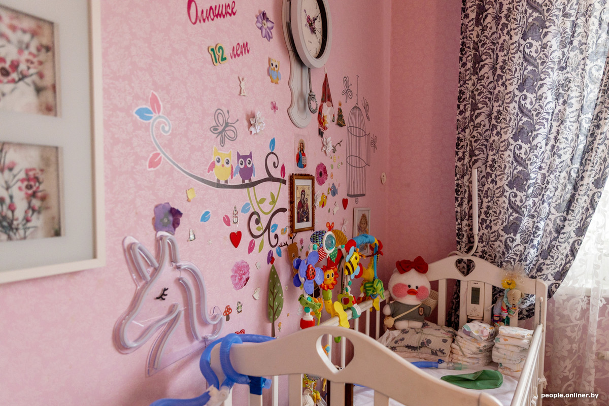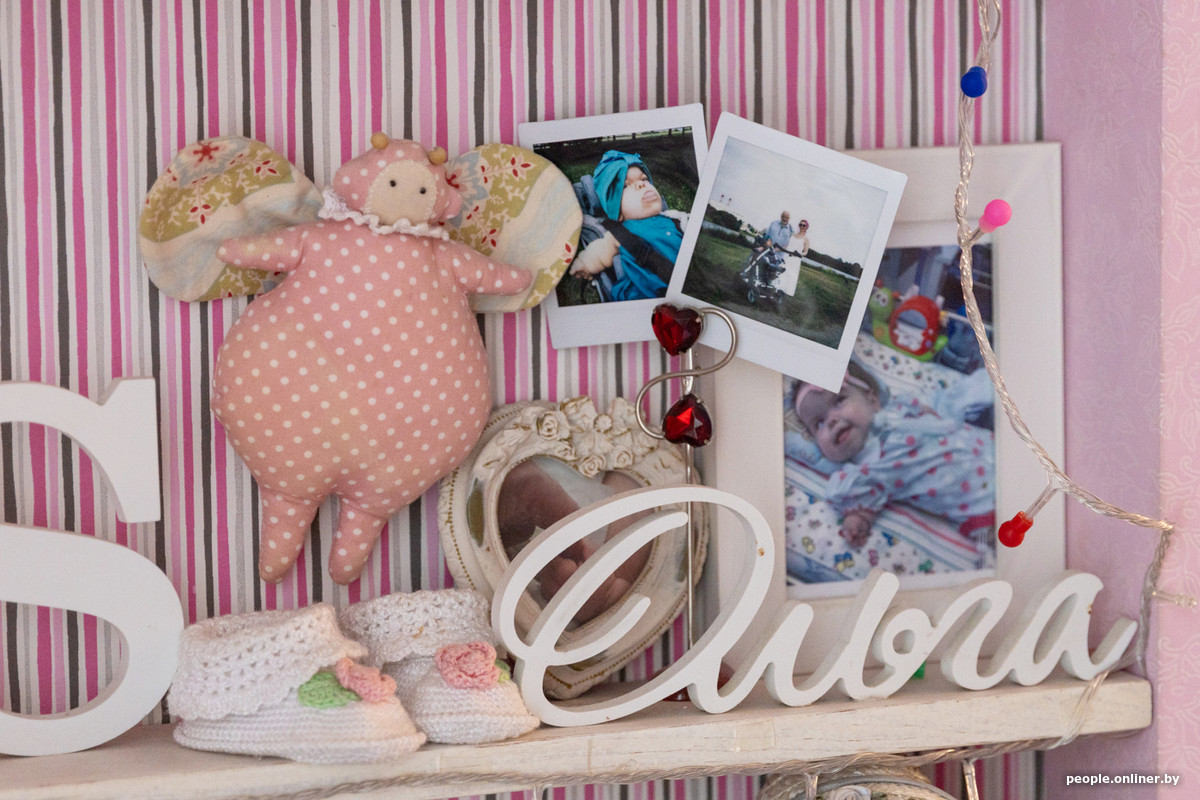 На стене в детской, где живет Оля, висит большой постер с фото The Beatles. Елена рассказывает, что раньше в комнате жила старшая дочь, а после ее переезда сюда переселили младшую. Олюшке, как ласково называют ее в семье, 12 лет. Но из-за особенности болезни девочка напоминает ребенка 2—3 лет. Рядом с детской кроваткой стоит аппарат ИВЛ — он нужен Оле с рождения. Лишь недавно каким-то чудом девочка научилась хотя бы немного дышать самостоятельно. На самом деле, в этой истории много удивительного: по статистике, такие дети умирают либо в утробе, либо в первые полгода-год жизни. Во всем мире, рассказывает мама, сейчас лишь двое детей с танатофорной карликовостью старше ее Оли.
