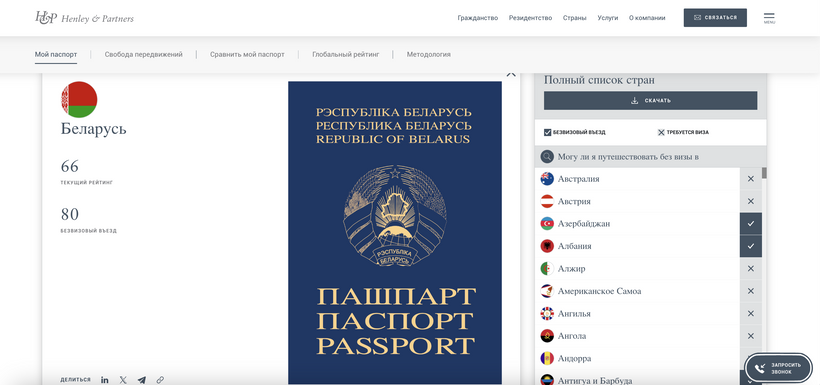 Беларусь в индексе паспортов находится на 66-м месте (по последним апдейтам в 2024 году — на 64-м) и разделяет его с Таиландом. Граждане обеих стран могут без виз путешествовать в 80 государств.