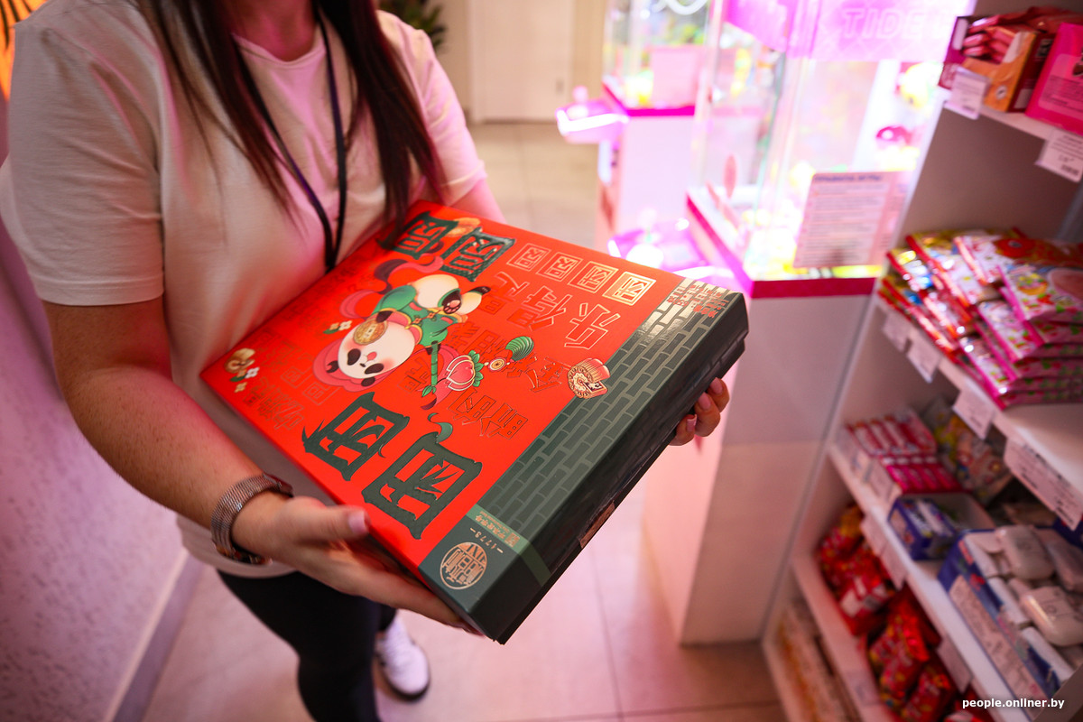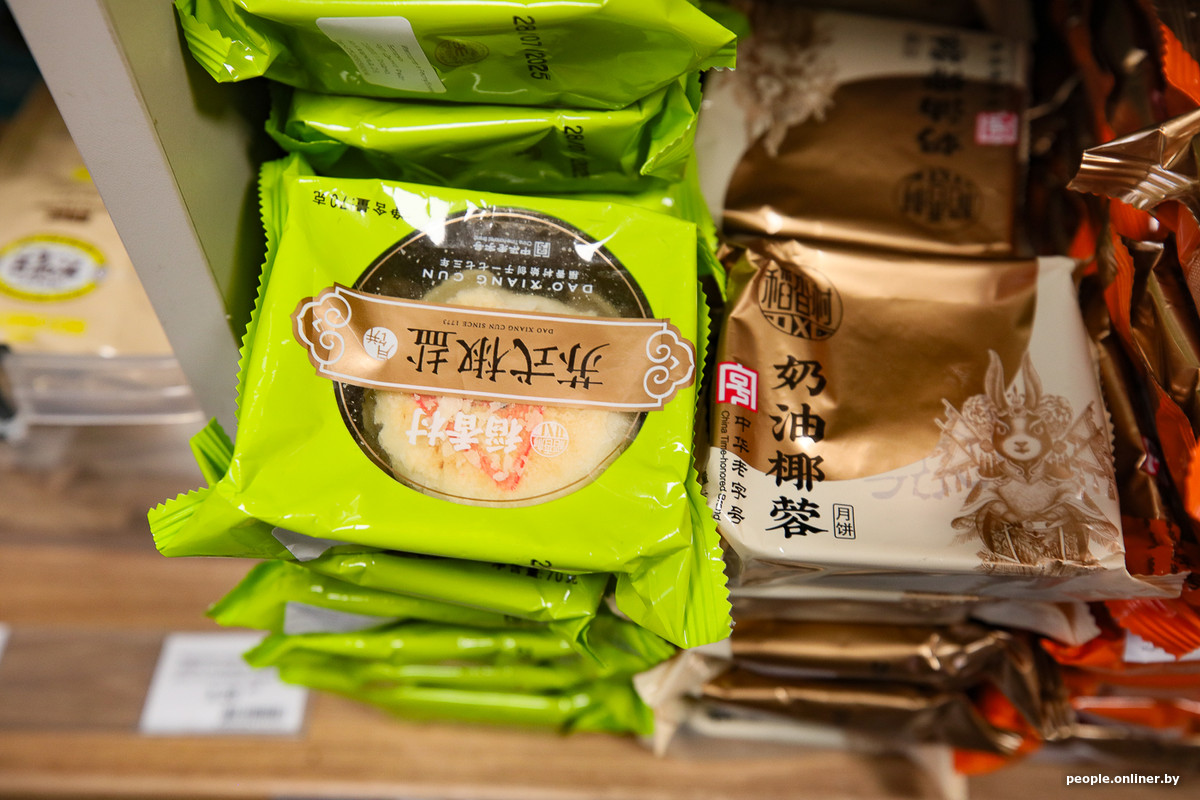 Самый дорогой товар на витрине — праздничная упаковка лунных пирогов. Это традиционный китайский десерт, который готовят и дарят близким на Праздник середины осени. Пироги стоило бы назвать, скорее, пирожными. В диаметре они всего 10 сантиметров. Теста почти нет, в основном только начинка — сладкая паста из бобов или семян лотоса. Часто в центр добавляют желток соленого утиного яйца, который и символизирует ту самую луну.