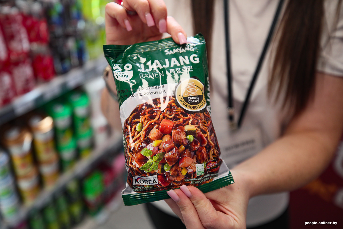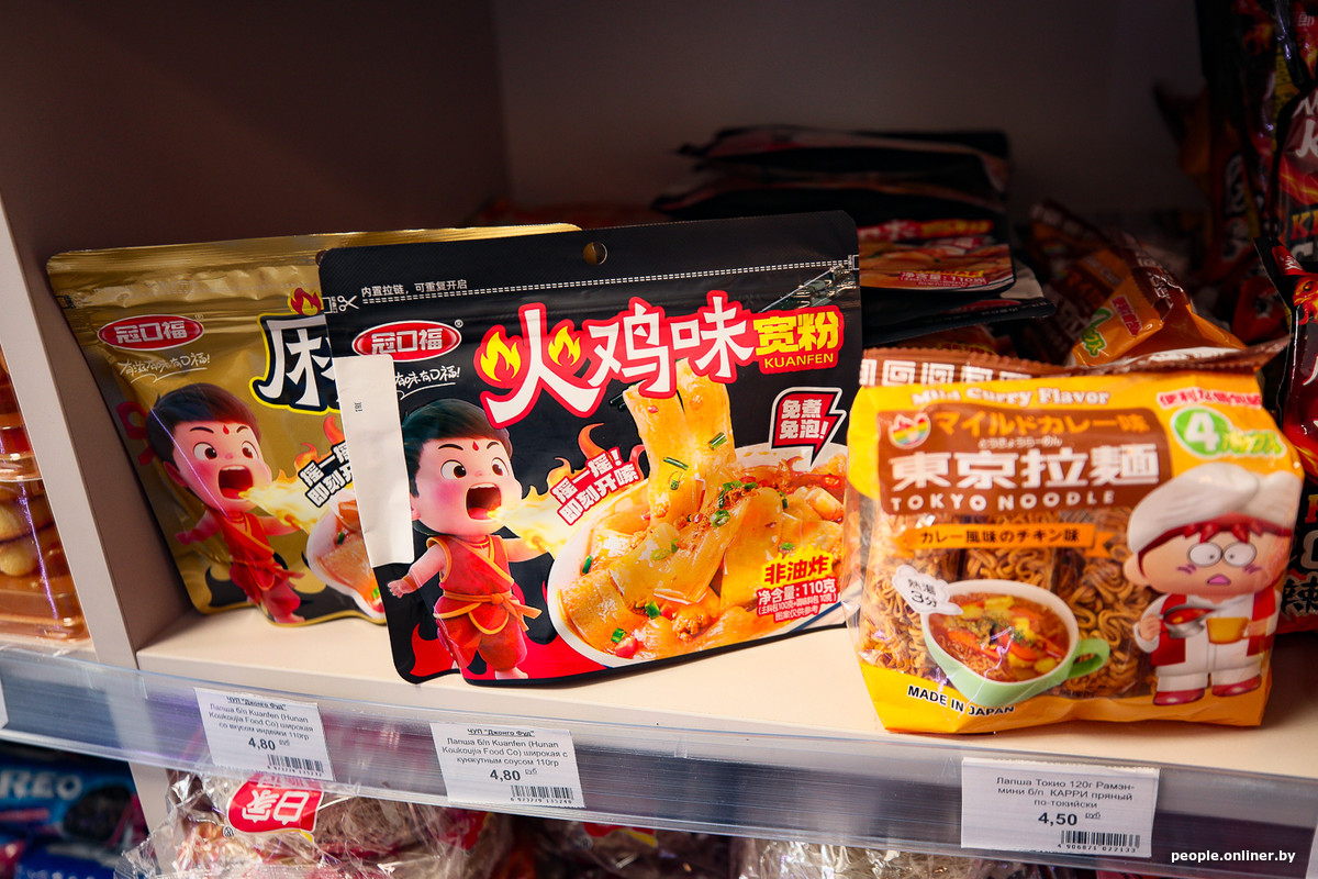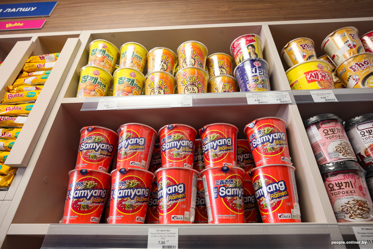 Что насчет цен в Беларуси? Чтобы выяснить это, для начала прогуляемся по магазину. Вся лапша распределена по четырем категориям: не острая, средне-острая, острая, и отдельный стенд выделен под бренд Buldak. С корейского это название переводится как «огненная курица». И не спроста: это линейка очень острых корейских раменов от той самой компании Samyang Foods. Она известна во всем мире, благодаря экстремальному вкусу и вирусным челленджам в соцсетях.