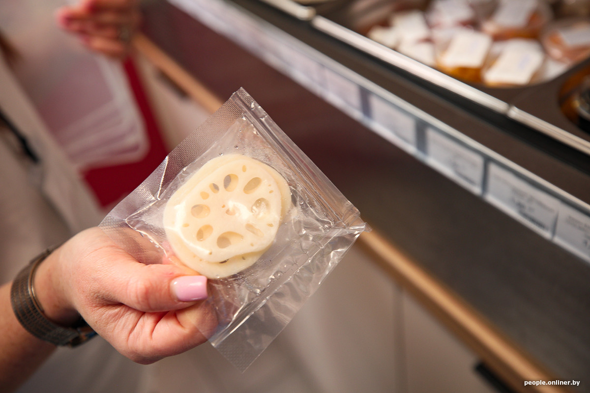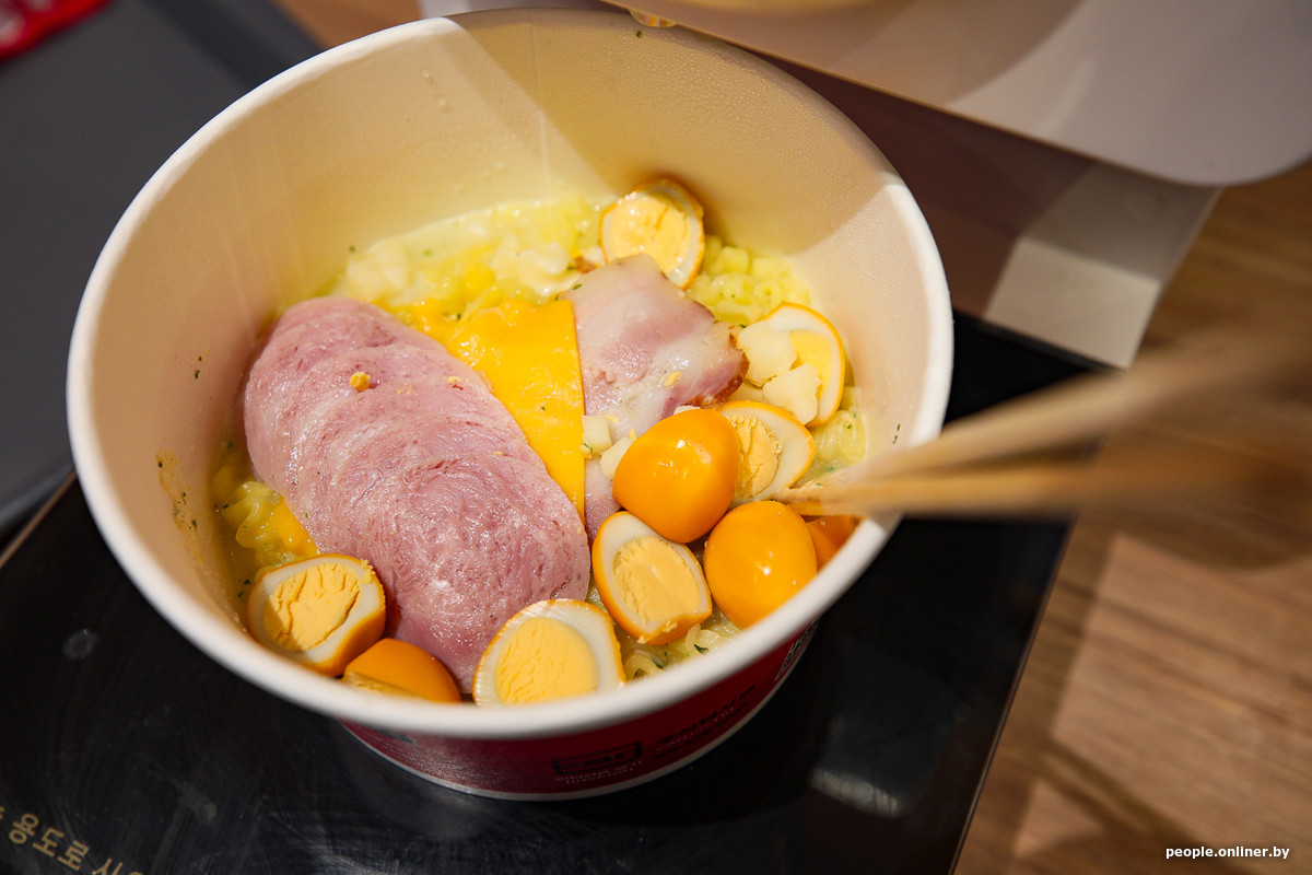 Курица, свинина, говядина, даже креветки вряд ли могут удивить белорусов. А вот у лапши со вкусом кимчи, жареного кунжута или бобового соуса еще есть шансы. Что касается добавок, то все тоже довольно привычно: разные виды сыра, копченые яйца, бекон, колбаса. Из общей картины выбиваются разве что корни лотоса и тофу.