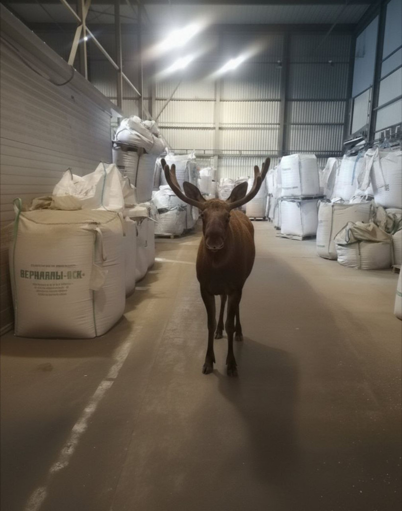 После обхода склада лось ушел обратно в лес. Ни животному, ни работникам ущерб нанесен не был.
