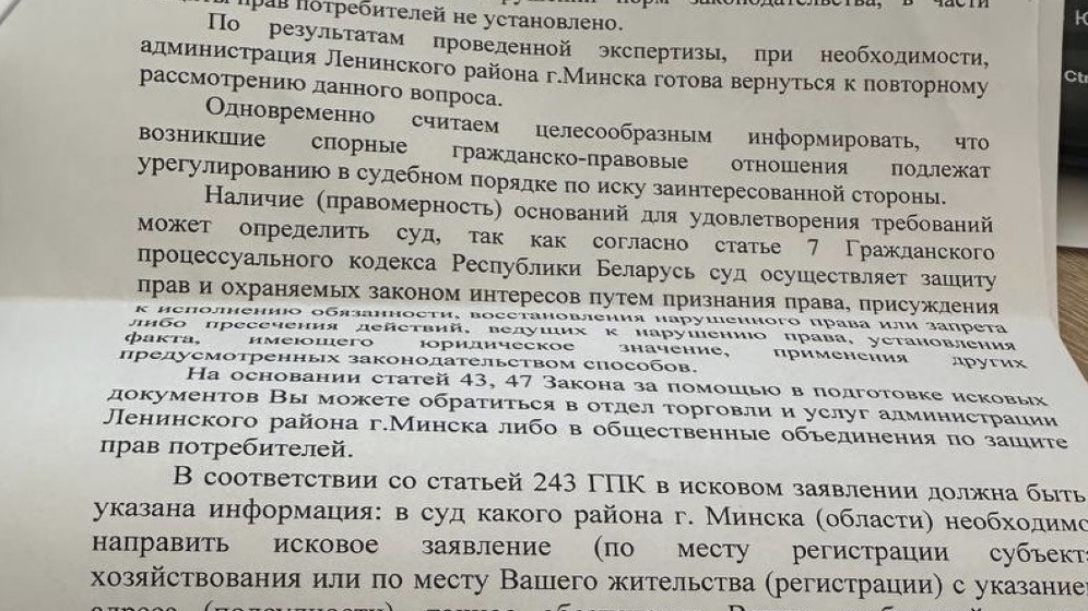 Обращение в администрацию Ленинского района г. Минска Кристина написала 15 сентября, а 20 октября получила ответ. В письме говорится, что услуга в квест-комнате «была качественной и соответствовала требованиям безопасности». Специалисты подтверждают информацию о том, что декоративное освещение имеет электропитание сверхнизкого напряжения в 12 В, поэтому электротравмы быть не могло.