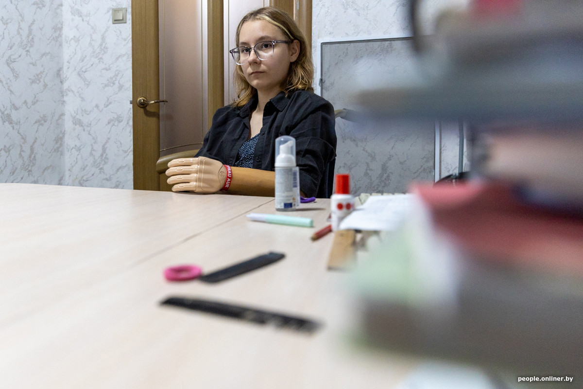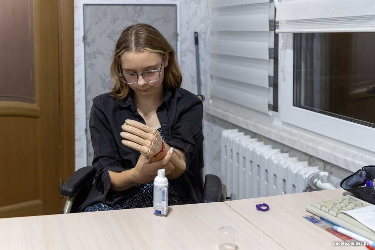 Женя решает показать нам, что «умеет» протез. Сперва нужно обработать руку, а затем ловким и привычным движением «подключается» техника. Через секунду девочка показывает, как берет со стола карандаш.