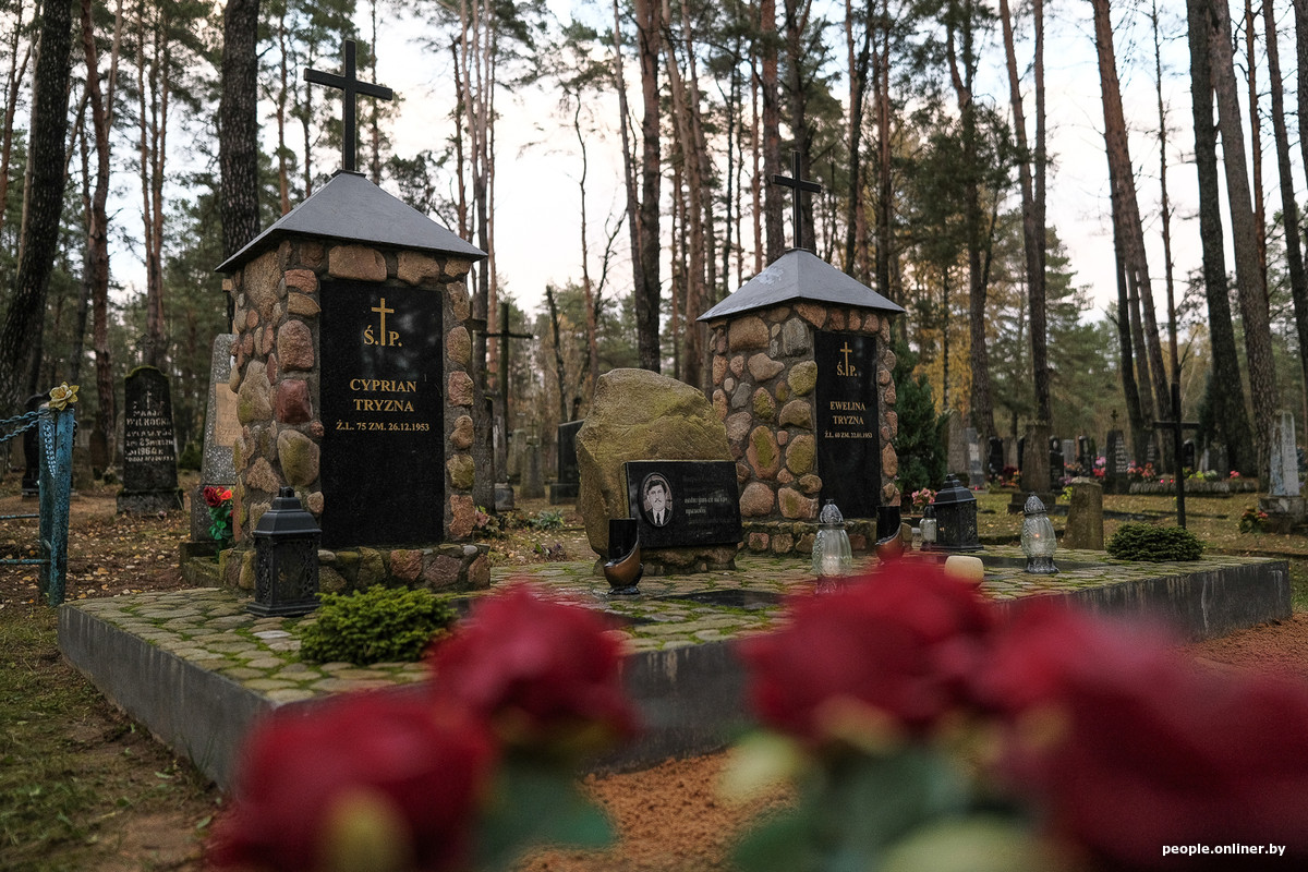 Вось такі прыгожы помнік паставілі на магіле мясцовага жыхара Цыпрыяна Трызны, ягонай жонкі і ўнучак. Як распавялі сваякі Цыпрыяна, якіх мы сустрэлі на могілках, помнік сімвалізуе вежы рубяжэвіцкага касцёла: іх калісьці ўзводзіў Цыпрыян. На магільнай шыльдачцы так і напісана: «Пакрываў вежы, устанавіў крыжы і, падняўшыся на крыж, прамовіў: „Будаўніцтва касцёла завершана!“»