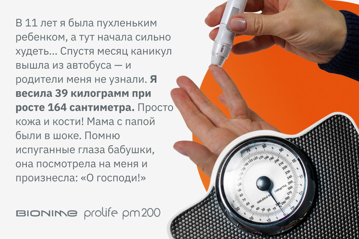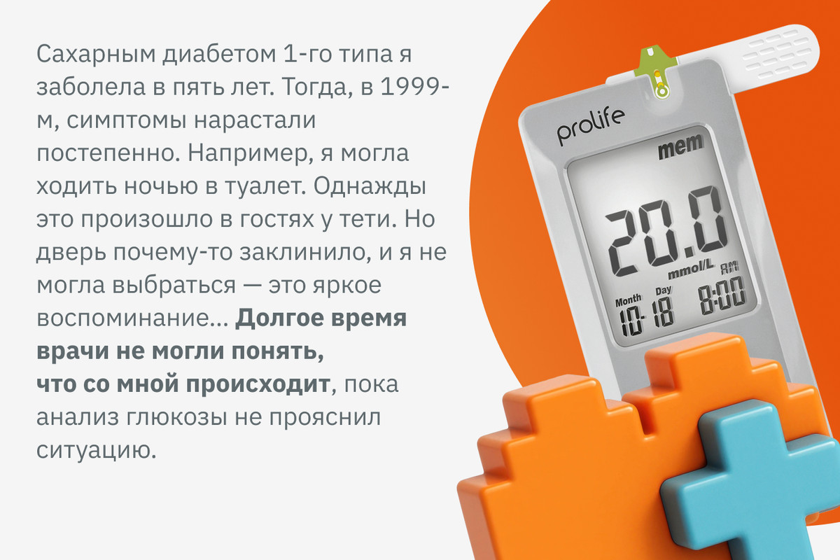 — Диагноз «сахарный диабет I типа» мне поставили в 11 лет. Все началось с того, что я стала очень сильно худеть. Была пухленьким ребенком, а тут — раз! — и сбросила вес. Родители думали: «Ну, такой возраст, вытягивается, растет. Все нормально».