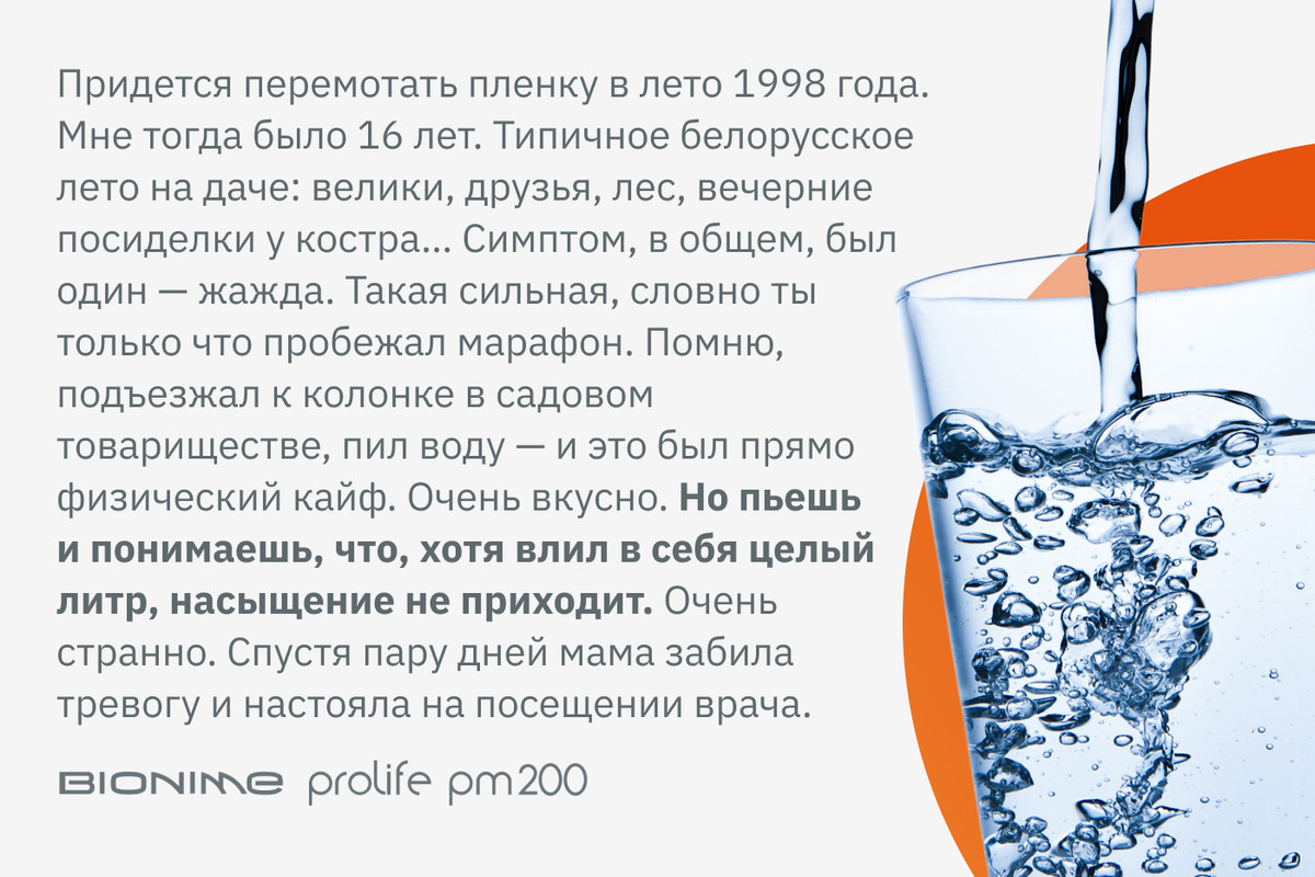 — Придется перемотать пленку в лето 1998 года. Мне тогда было 16 лет. Представьте типичное белорусское лето на даче: велики, друзья, лес, вечерние посиделки у костра… Симптом, в общем, был один: жажда — такая сильная, словно ты только что пробежал марафон. Помню, подъезжал к колонке в садовом товариществе, пил воду, и это был прямо физический кайф. Очень вкусно. Но пьешь и понимаешь, что, хотя влил в себя целый литр, насыщение не приходит. Через полчаса история повторялась. Мягко говоря, это выглядело очень странно. Спустя пару дней мама забила тревогу и настояла на посещении врача.