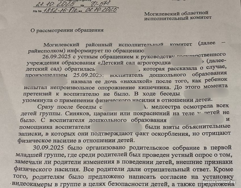 Валентина также обратилась в Могилевский облисполком. В конце октября ей пришел ответ, где говорилось, что «с воспитателя дошкольного образования и помощника воспитателя были взяты пояснительные записки, в которых они подтверждают факт оскорбления, но отрицают физическое насилие в отношении детей».