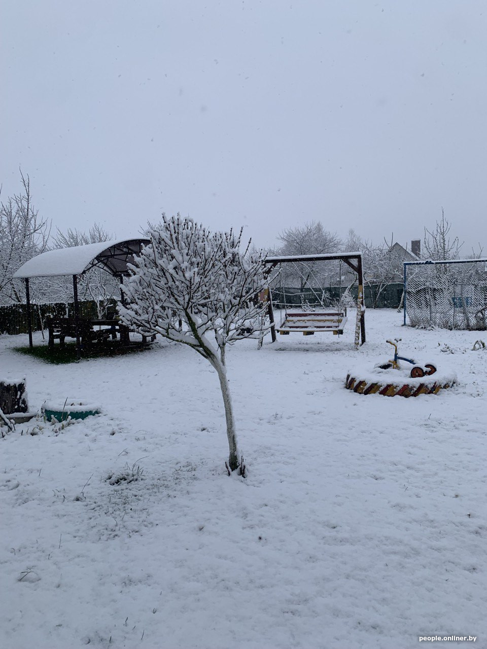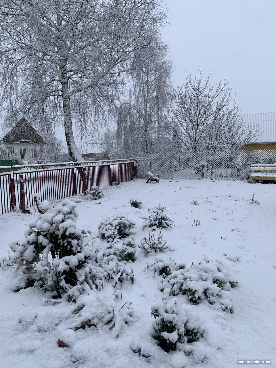Судя по фотографиям, сделанным местным жителем, снег лег равномерно и густо. Ветки деревьев прогнулись под тяжестью, а на дорогах уже заметны следы машин, которые первыми разъезжали свежий наст.