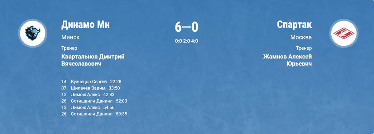 «Динамо» снова побеждает на «Минск-Арене» — уже в четвертый раз подряд — и снова крупно. На этот раз обыгран московский «Спартак», счет — 6:0. Минчане дважды забрасывали во втором периоде и четыре раза — в третьем.