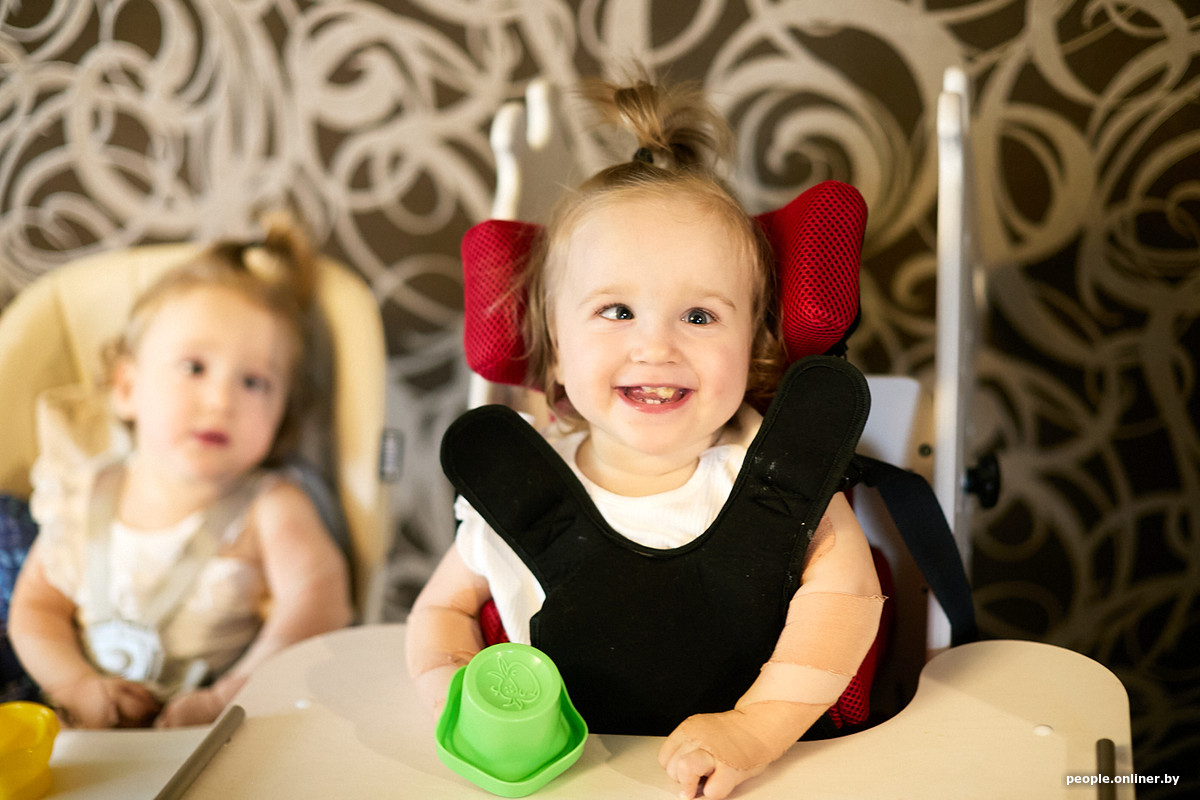 — Просыпаемся, кушаем, одна становится в вертикализатор на 30—40 минут, со второй идем заниматься. Обязательные упражнения — растяжка, ЛФК, занятия на фитболе и массаж. Ближе к двенадцати часам — обед и сон на улице, затем кормим специальной смесью, снова ставим девочек в вертикализатор, делаем упражнения, ужин, снова занятия и массаж, — рассказывает о своей рутине Настя, а девочки тем временем с интересом рассматривают нежданных гостей.
