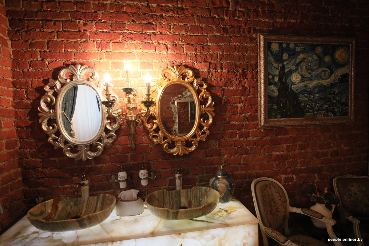 Еще из интересных фишек, на которые гостям стоит обратить внимание, — светящаяся столешница для умывальников из оникса, витражные светильники, ниша в полу с рисунками и подсолнухами под стеклом, а еще чугунная плитка на втором этаже — тоже с узнаваемым «вангоговским» узором.