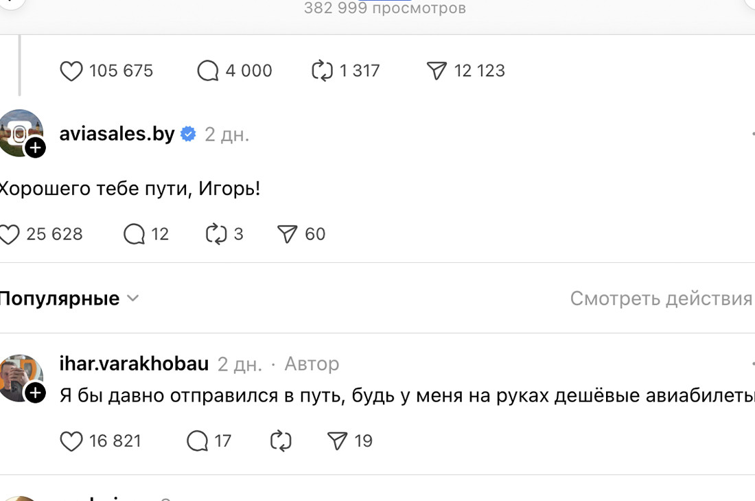 Этот, казалось бы, обычный пост взорвал белорусский Threads. Он залетел в рекомендации, и публикацию стали массово комментировать и лайкать. К обеду среды суммарное количество комментариев достигло 4 тысяч. Маркетолог Aviasales пожелал Игорю хорошей дороги, а тот не растерялся и ответил: «Я бы давно отправился в путь, будь у меня на руках дешевые авиабилеты».