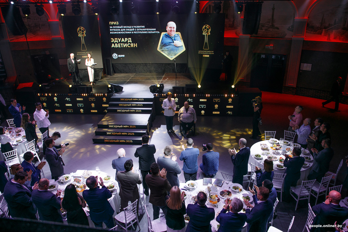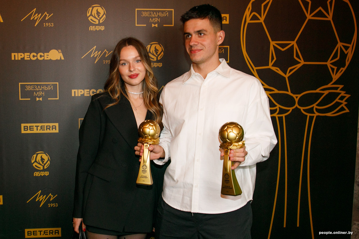 Все постепенно шло к завершению, и присутствующие ждали, когда же объявят главного победителя — лучшего футболиста Беларуси 2025 года. Хотя, будем откровенны, многие заранее догадывались, что статуэтка уйдет полузащитнику Валерию Громыко. В этом году он с «Кайратом» из Алматы вышел в основной раунд Лиги чемпионов, забивает за сборную, им активно интересуются клубы из Турции. В итоге так и получилось. Правда, футболиста в зале не было: он готовится к еврокубковым матчам с «Кайратом», и получать награду поднялись его родители, Игорь Анатольевич и Инна Викторовна.