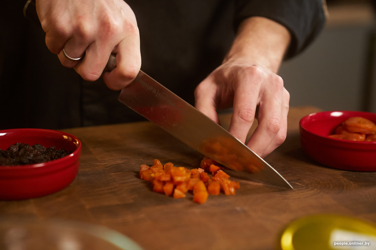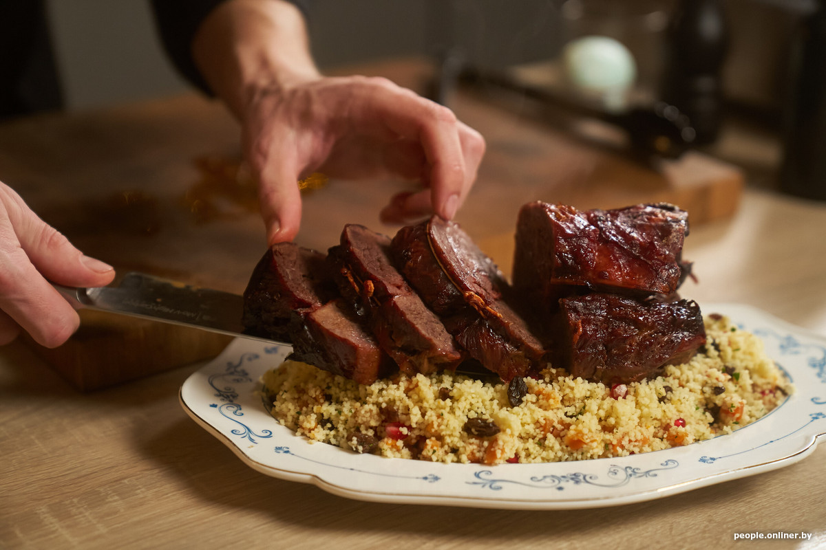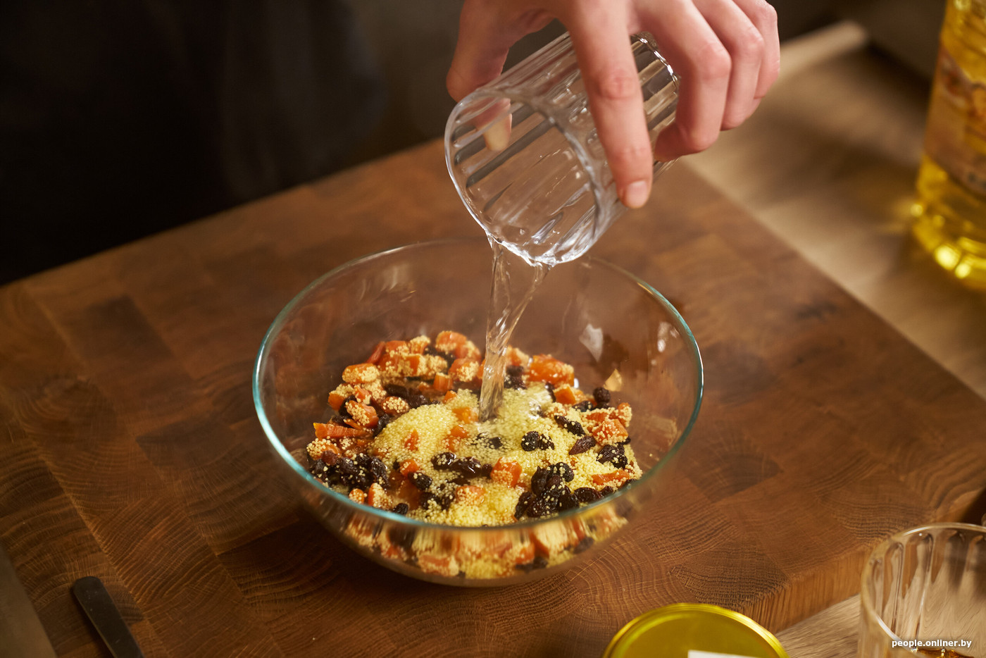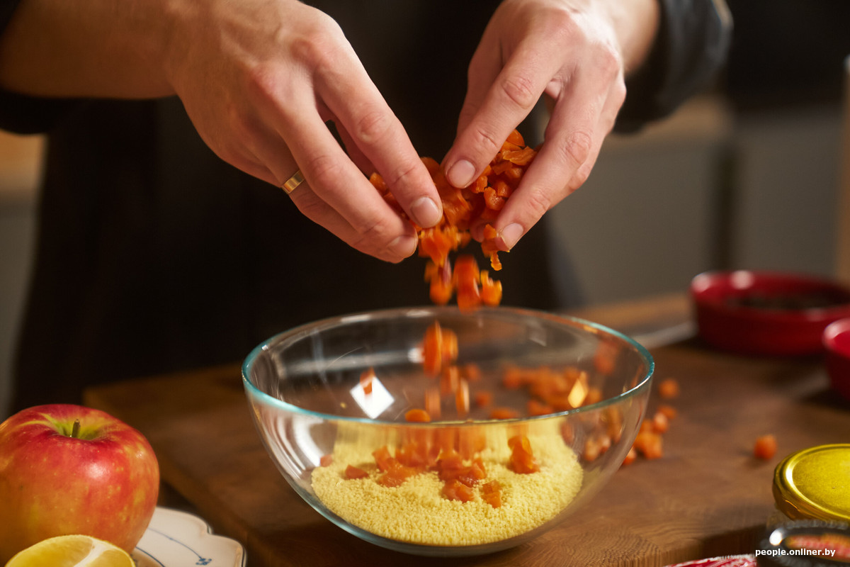 Отправляем яблоки отдыхать, на всякий случай проверяем, не исчезло ли из духовки мясо, и затем приступаем к гарниру для говяжьего рулета. Им у нас будет служить кускус — популярная у тунисцев и марокканцев крупа, по сути та же манка, только спрессованная в небольшие комочки. Чего-чего, а североафриканских мотивов на нашем экспресс-столе мы точно не ожидали. Шеф же подмигивает, мол, одним лишь «пустым» кускусом мы не ограничимся, сейчас добавим ему яркости и вкуса при помощи сушеных и свежих фруктов, а еще зелени.