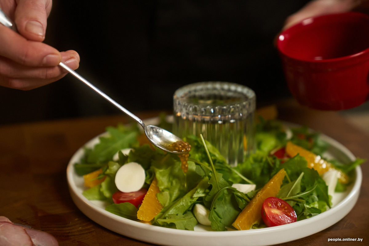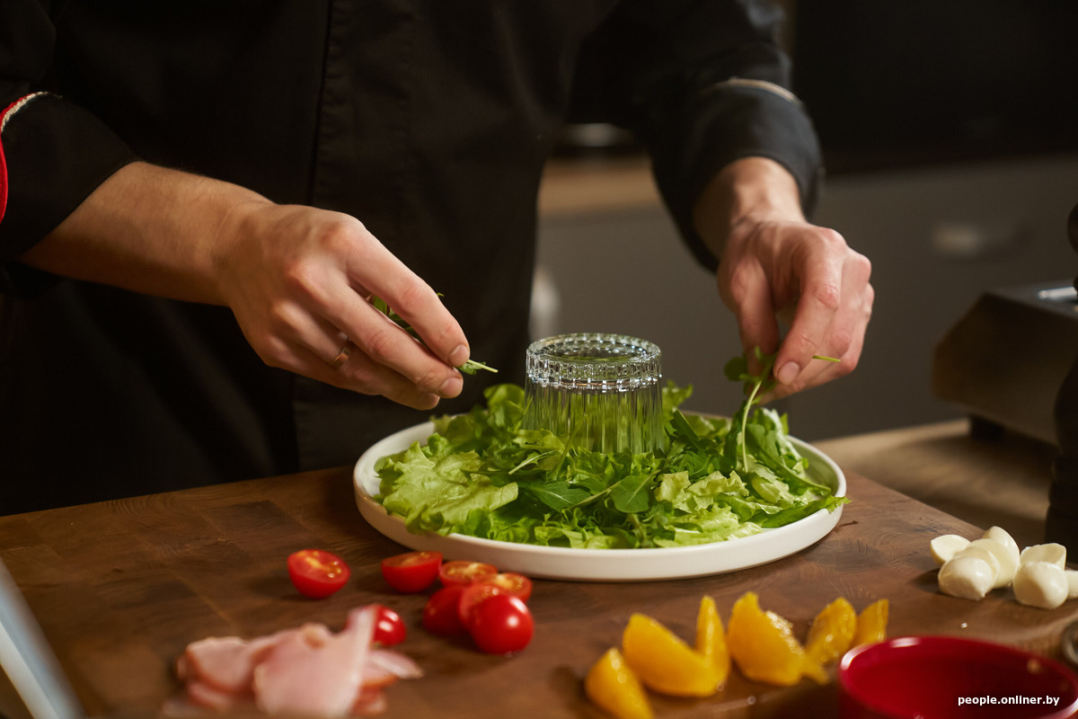 Красиво, по-ресторанному выкладываем, «через стакан». Его ставим перевернутым по центру блюда. Салат произвольно рвем руками и выкладываем вокруг. Под салатом, кстати, здесь имеем в виду импровизационный микс из рукколы, салатных листьев, микрозелени, шпината — в общем, чего вашей душе угодно. Главное, чтобы все это было свежим, пышным, хрустящим.