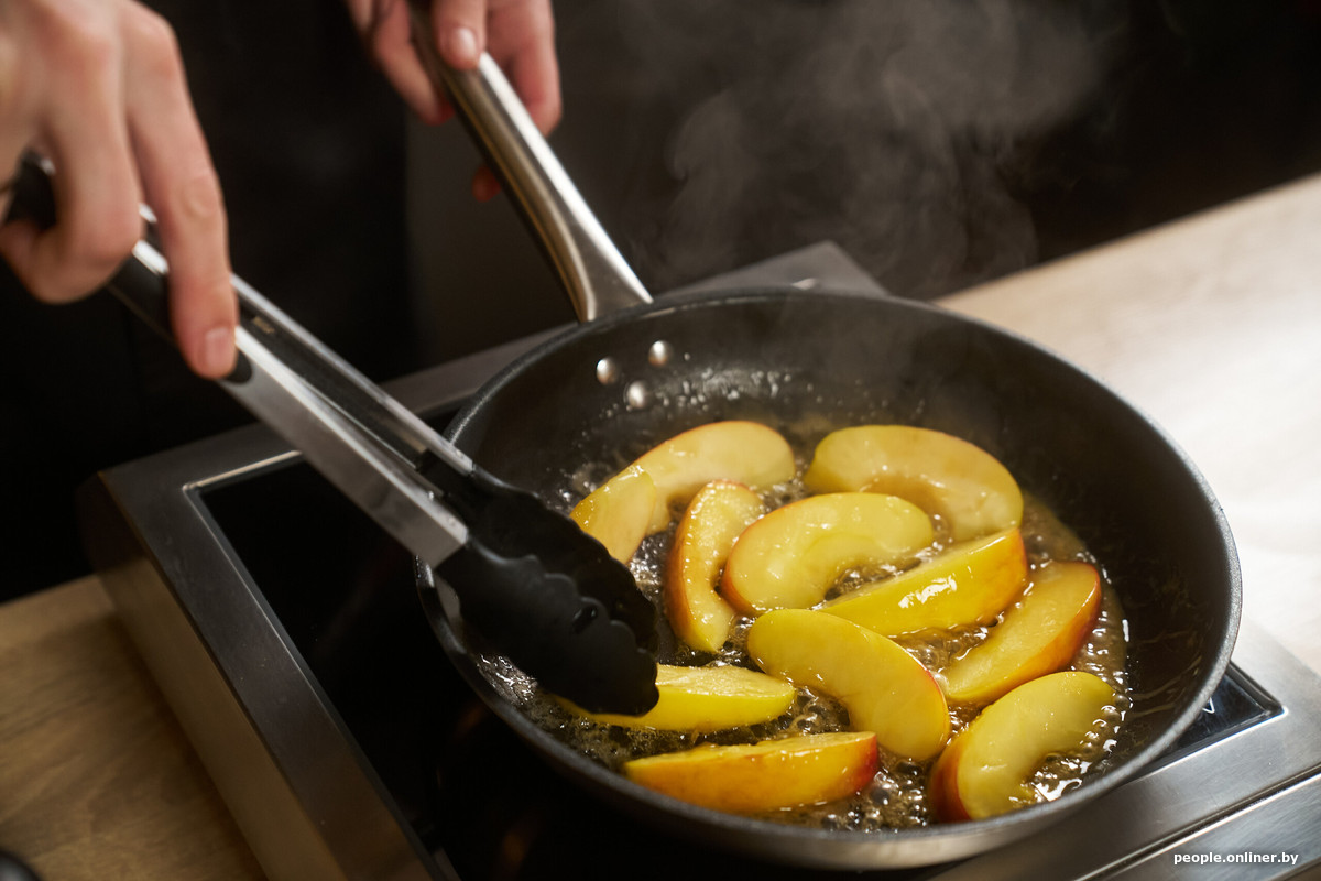 Про яблоки не забыли? Приступаем к их глазированию. Разогреваем сковороду, бросаем кубик сливочного масла, сверху — столовую ложку меда. Размешиваем в густоватую субстанцию, увеличиваем огонь и выкладываем на сковороду яблоки. Все, какое-то время их не трогаем — пока не подзолотятся с одной стороны. Только после этого переворачиваем лопаткой (если вы за аккуратность и надежность) или по-поварски перебрасываем (если рядом есть тот, перед кем хочется выпендриться) на другую сторону.