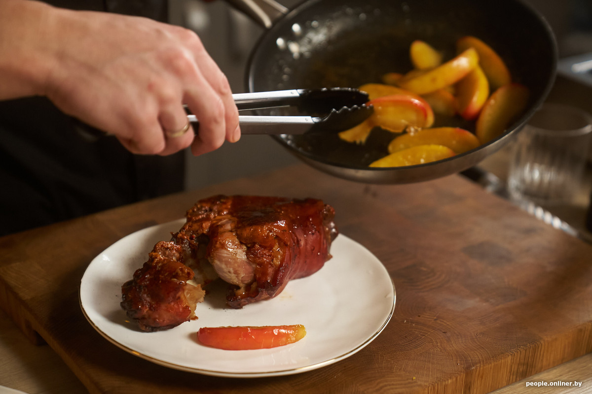 Что там с рулькой и рулетом? «Если видим, что мясо уже прямо-таки распадается, отходит от самого себя, а не то что от кости — значит, оно на сто процентов готово», — комментирует вытащенную из духовки красоту Дмитрий.